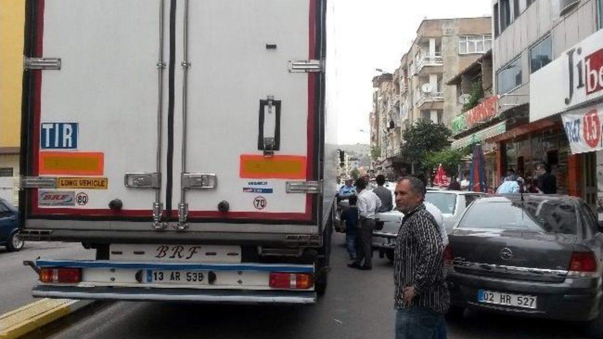 Adıyaman merkez Eski Zey Caddesi üzerinde yol kenarına park eden araçlar nedeniyle tır ilerleyemedi.Adıyaman...