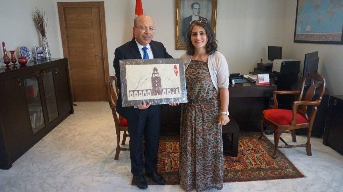 Trabzon’daki TILSIM Uluslararası Sanat Derneği Başkanı olan ebru sanatçısı Songül Kartal Tunus’un Monastir şehrinde 16 ülkenin katılımıyla gerçekleşen uluslararası sanat fuarına katılarak ebru sanatını tanıttı.Kendisinin ebru sanatıyla ,dernek üyeleri Mustafa Çamurali’nin tezhip, Ayşegül Kartal’ın ise filografi sanatıyla fuara katıldığını belirten Kartal, Tunuslu ressam Nejib Rokbani’nin 3 İslam sanatıyla festivale renk kattığını söyledi. Kartal, bu yıl da Çin’den Tunus’a toplam 16 ülkede ebru sanatını tanıttıklarını belirterek Tunus’ta bulundukları süre içinde Tunus Türkiye Büyükelçisi Ömer Faruk Doğan’ı makamında ziyaret ettiklerini belirtti.Ziyarette büyükelçi Doğan’a ebru ile yapılmış bölgeye ait bir cami çalışması hediye eden Kartal, Doğan ile yapılabilecek etkinlikler üzerine görüş alışverişinde bulunduklarını sözlerine ekledi.