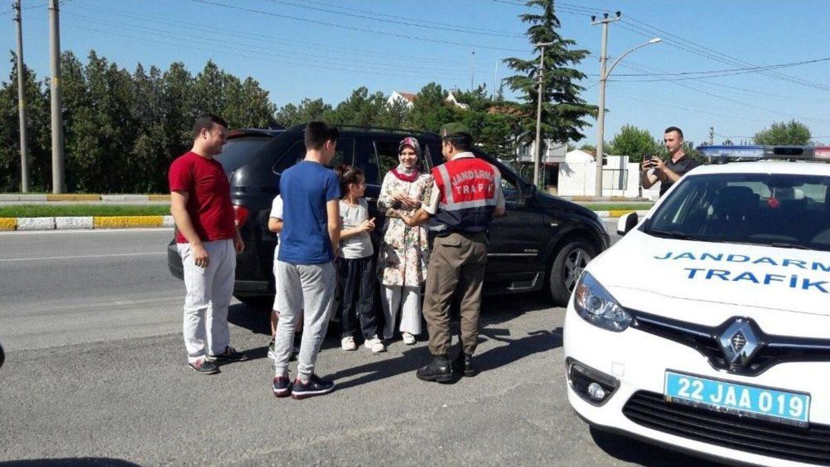 Edirne Jandarma Trafik timleri, Kapıkule’den giriş yapan gurbetçi sürücülere ve seyahat eden yolculara şeker ve çikolata ikram ederek bayramlarını kutladı.Tatil yolunda sorunsuz bir yolculuk geçirmeleri için uyulması gereken kuralları hatırlatan jandarma timleri, ‘Frene değil kurala güven’ algısı içeren uyarı broşürleri dağıttı.Edirne Jandarma Komutanlığına bağlı ekiplerce sorumluluk alanlarında yapılan yol denetimleri ve kontrollerde, Kurban Bayramı süresince alkollü araç kullanımı, emniyet kemerinin önemi ve hız konularında sürücüler uyarıldı.