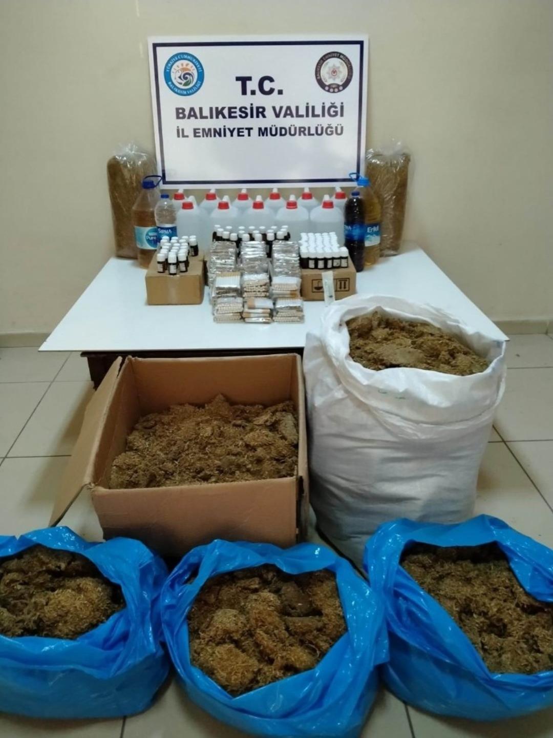 Edinilen bilgiye göre ekipler, ‘Kaçak Tütün ve Alkollü İçki İmal ve Ticareti’ ile mücadele kapsamında yapılan çalışmalar doğrultusunda şüpheli şahıslara ait depo olarak kullanılan ikamet ve araçta yapılan aramada; 58 kilogram açık tütün, her biri 5’er litrelik 11 bidon etil alkol ve 1,5 litre etil alkol, 40 adet alkol aroması, 56 adet alkol kiti, 37 adet anason, 5 adet şişe, 1 adet şırınga, 10 litre yapılmış votka, 1,5 litre yapılmış viski, bin 500 adet dolu makaron ele geçirdi. Arama kararı gereğince ele geçirilen maddelere el konuldu. şüphelilerin gözaltına alındığı olayla ilgili tahkikatın sürdüğü öğrenildi.