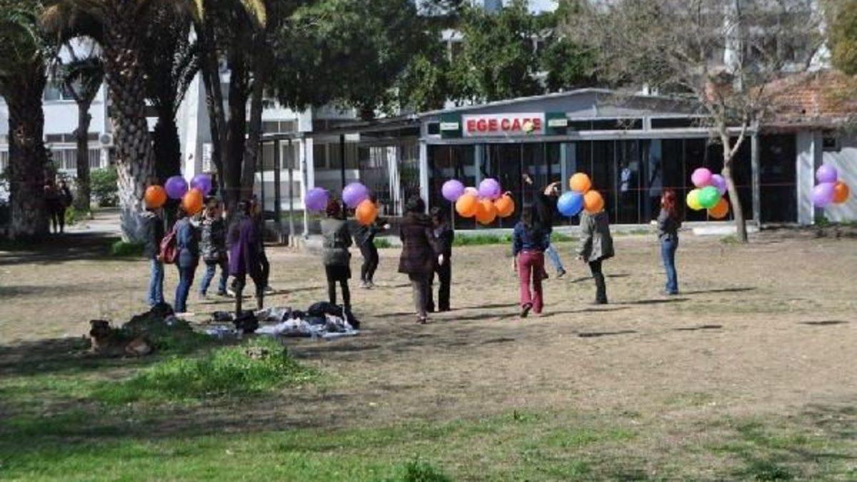 Tufan HAMARAT/İZMİR, Ege Üniversitesi'nde eğitim gören bir grup öğrenci, öğle saatlerinde Edebiyat Fakültesi yakınındaki boş alana iple balon astı. Türkü söyleyip halay çeken zaman zaman da voleybol oynayan öğrenciler, kadın cinayetlerine dikkat çekmek için toplandıklarını dile getirdi. Polis ve özel güvenlik görevlileri alan çevresinde geniş güvenlik önlemi aldı. Bir süre sonra, özel güvenlik görevlileri, geçen hafta Fırat Çakıroğlu'nun öldürülmesi ardından Rektörlüğün tüm basın açıklaması ve gösterileri yasakladığı gerekçesiyle alandaki balonları patlattı. Çoğunluğunu kızların oluşturduğu öğrenciler duruma tepki gösterdi. Kısa süreli gerginlik ardından öğrenciler tekrar iple balon astı, özel güvenlik görevlileri de ikinci kez müdahale edip balonları tekrar patlattı. Daha sonra, özel güvenlik görevlileri alandan ayrıldı. Öğrenciler bir kez daha balon asarken, voleybol oynamaya başladı. Polis ve özel güvenlik görevlilerinin okuldaki güvenlik önlemleri sürüyor.