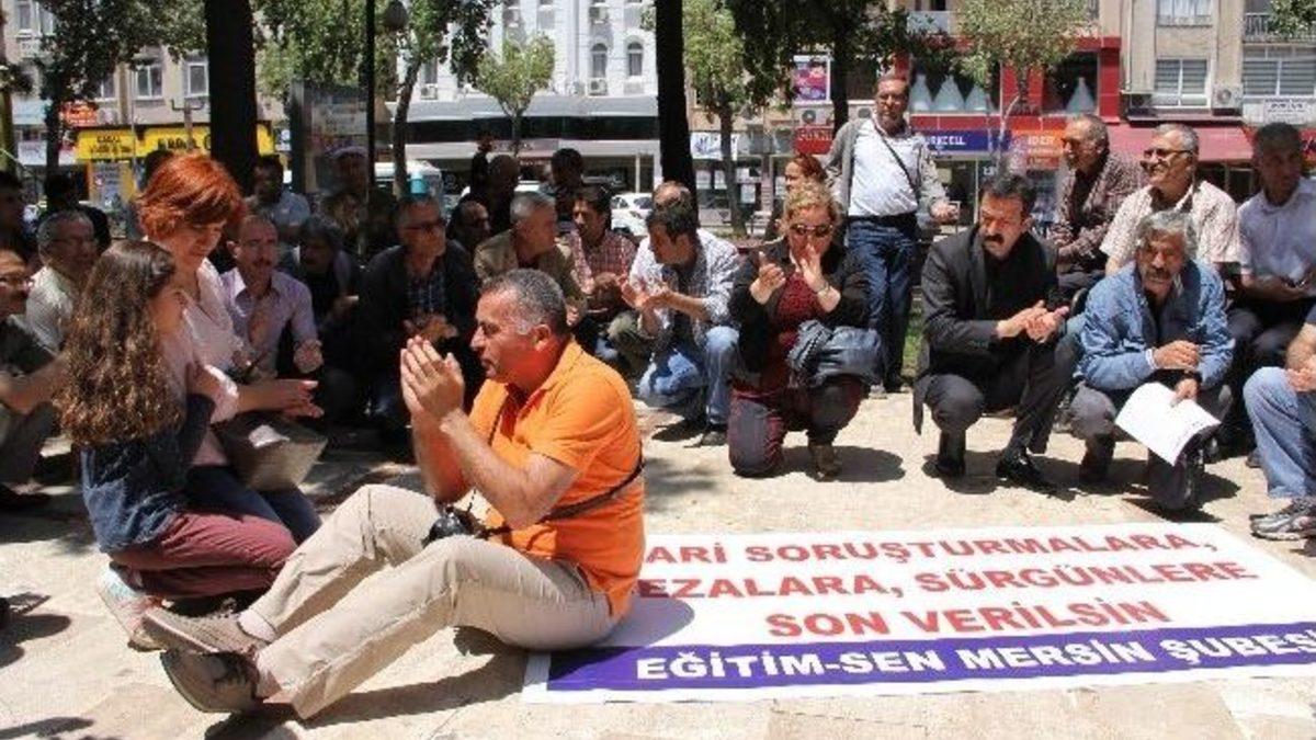 Mersin’de Eğitim-Sen üyeleri, Eğitim-Sen ve bağlı olduğu KESK’e yönelik soruşturma, sürgün ve görevden alma girişimlerin son dönemde arttığı gerekçesiyle oturma eylemi yaptı.Eğitim-Sen Mersin Şubesi üyeleri, öğle saatinde İstiklal Caddesi üzerindeki Özgür Çocuk Parkı’nda toplandılar. Burada sloganlar atarak sendika üyelerine yönelik baskıları protesto eden grup, sürgün, soruşturma ve ceza uygulamalarının bir an önce sona ermesini istediler.Eğitim-Sen Mersin Şube Başkanı Sinan Muşlu, grup adına yaptığı konuşmada, son dönemde Eğitim-Sen ve bağlı olduğu KESK üyelerinin idari soruşturmalara ve baskılara maruz kaldıklarını söyledi. KESK’in, bu ülkenin demokrasi mücadelesinde, emekçilerin hak kazanımlarında, özgürlükler ve barış mücadelesinde önemli katkılar sunan, önemli bedeller ödeyen bir örgütlenme olduğunu belirten Muşlu, uygulanan baskı politikalarından hükümeti sorumlu tuttu. Muşlu, “Eğitim-Sen’in ve KESK’in böylesi bir misyonu karşısında mevcut iktidarın ve iktidara bağlı organların üyelerimizi idari soruşturmalar kıskacına almaları asla kabullenilemez. Konfederasyonumuza bağlı Eğitim-Sen’in üyelerinin karşı karşıya kaldığı gözaltı, tutuklama, idari soruşturmalar, sürgünlerin sayısı son dönemlerde daha da artmaya başlamıştır. Ancak ne Eğitim-Sen ne de KESK bu tür yönelimler karşısında geri adım atabilecek, yılacak bir örgüt değildir” dedi.Özellikle son dönemlerde uyarı ve kınama cezalarının yanı sıra kademe ilerlemesinin durdurulması, hatta devlet memurluğundan uzaklaştırma cezaları verilmeye başlandığını öne süren Muşlu, “Üstelik görev yeri değişikliği kararı verilen arkadaşlarımız var. Bunları protesto ettiğimizi, bu idari soruşturmaların, sürgün ve cezaya dair kararların biran önce durdurulmasını ve bu uygulamalara son verilmesini talep ediyoruz. Eğer bu adımlar, Eğitim-Sen ve KESK’e bağlı arkadaşlarımızın geri adım atacağını, yılacağını, mücadelesinden geri duracağını hesaplayarak atılan adımlarsa bu beyhude bir çabadır. Buradan tekrar ilan ediyoruz ki, KESK, Eğitim-Sen ve diğer iş kollarındaki üye arkadaşlarımız asla bu baskı, sürgün ve ceza politikalarından yılmayacak, geri adım atmayacak, mücadelesini daha da yükseltecektir” diye konuştu.Eğitim-Sen üyeleri daha sonra idari soruşturmaların son bulması, verilen cezaların geri alınması ve sürgün politikalarının durdurulması için 5 dakikalık sembolik oturma eylemi yaptılar.