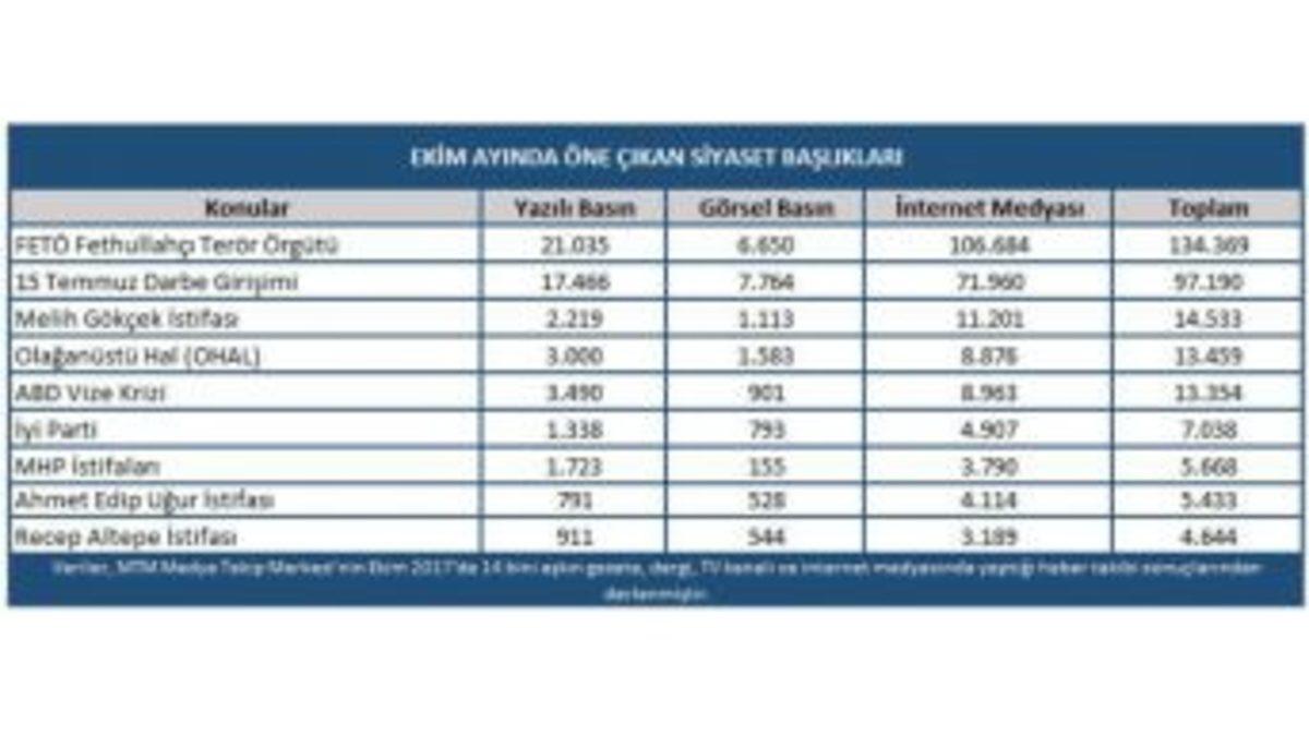 Siyaset gündeminde Ekim ayında Fethullahçı Terör Örgütü (FETÖ), ABD ile yaşanan vize krizi ve belediye başkanlarının istifası vardı.Medya Takip Merkezi (MTM) Ekim ayı siyaset gündemi raporunu açıkladı. Ekim’de AK Parti belediye başkanları ile ilgili değişim sürerken, ABD ile yaşanan vize krizi nedeniyle uluslararası siyasette hareketli dakikalar yaşandı. Uzun yıllar Ankara Büyükşehir Belediye Başkanı olarak görev yapan Melih Gökçek 22 Ekim günü istifa etti. İstifasının yankıları hala devam ederken, Ankara Büyükşehir Belediyesi’nin yeni başkanı da belli oldu. İstifası oldukça ses getiren Gökçek, katıldığı bir canlı yayında Cumhurbaşkanı Recep Tayyip Erdoğan’a inandığını belirterek, görevini bıraktığını açıkladı. İstifa sürecinin konuşulmasının yanında yaptığı açıklamalarla da gündemden düşmeyen Gökçek, Ekim ayı boyunca medyada toplamda 14 bin 533 haberin konusu oldu.OHAL 3 ay uzatıldıCumhurbaşkanı Recep Tayyip Erdoğan başkanlığında toplanan Bakanlar Kurulu’nda çeşitli başlıklar ele alındı. Bakanlar Kurulu toplantısının ardından açıklama yapan Başbakan Yardımcısı ve Hükümet Sözcüsü Bekir Bozdağ, ’Kuzey Irak’a yönelik olarak Türk hava sahasının kapatıldığını ve OHAL’in 3 ay daha uzatıldığını’ açıkladı. En çok konuşulan başlıklardan olan Olağanüstü Hal (OHAL), ay boyunca 13 bin 459 haberde yer aldı.Vize krizinde yeni adımTürkiye ile ABD arasındaki diplomatik ilişkiler, siyaset ve ekonomiye yön veren başlıklardan biri oldu. Geçtiğimiz gün ise Türkiye Washington Büyükelçiliği ABD vatandaşlarının vize başvurularını sınırlı ölçüde almaya başladığını açıkladı. Başbakan Binali Yıldırım, vize kriziyle ilgili yaşanan son gelişmeleri, “Sınırlı da olsa başlaması olumlu” şeklinde nitelendirdi. İki ülke arasında ilişkilerin gözden geçirilmesine neden olan bu durum, Ekim ayında en çok konuşulan başlıklardan oldu.İyi Parti kurulduTürk siyasetinin 87’nci partisi olan ‘İyi Parti’ Meral Akşener’in önderliğinde resmen kuruldu. Akşener, oybirliğiyle İyi Parti Genel Başkanlığı’na seçildi. Yeni kurulan partinin sloganı ise "Türkiye iyi olacak” oldu. Parti kuruluşunun yanı sıra ismi ve sloganı ile de konuşulan İyi Parti, 7 bin 308 haberde yer aldı.