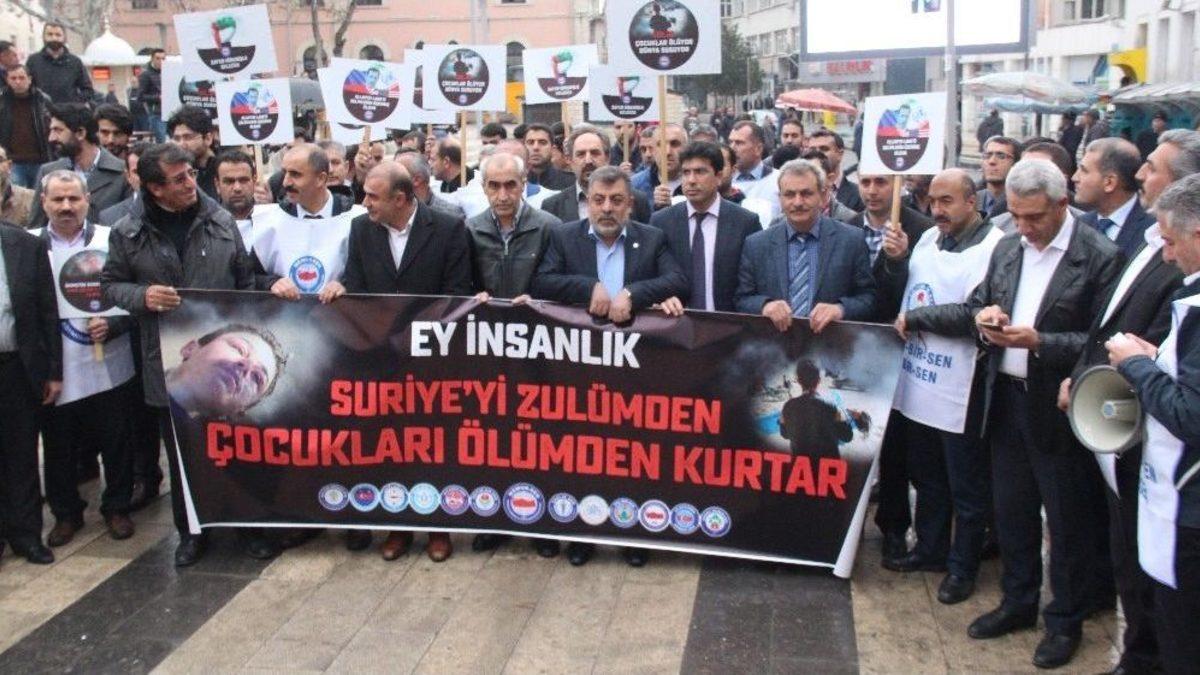 Elazığ’da toplanan kalabalık Suriye’nin İdlip kentinde yaşanan vahşete tepki gösterdi.Esed Rejimi tarafından Suriye’nin İdlip kentinde kimyasal silah kullanılması sonucu 100’ün üzerinde çoğunluğu çocuk ve kadın hayatını kaybetmişti. Elazığ’da Cuma namazı sonrası 15 Temmuz Demokrasi Meydanında toplanan Memur-Sen Elazığ şubesi üyeleri ve vatandaşlar İdlip’te yaşanan katliama tepki gösterdi. Pankartlarla meydana gelen kalabalık Esed karşıtı slogan attı.Esed’in gitmesi ve zulmün bitmesi için bir araya geldiklerini belirten Memur-Sen Elazığ Şube Başkanı İbrahim Bahşi, “4 Nisan’da İdlib’te Esed canisinin zulüm makineleri tarafından kimyasal silahlarla çocuklar olmak üzere 150’nin üzerinden insan katledildi. İdlip ne ilktir nede engelleyemezsek son olacak. Hama’da Halepçe’de, Halep’te yaptıklarını İdlip’te de tekrar ettiler. İnsanlık Baas rejiminin vahşetini boş gözlerle izledikçe İran, Rusya ve Esed soykırımını da aşan vahşetine devam ediyor. Vahşetin üç atlısı, üç maymunu oynayan uluslararası toplumdan güç alarak vahşet galerisini büyütüyorlar. Esed’in yaşaması için kardelenleri kanla suluyorlar. Barış ve huzur güvercinlerini kanatlarından vuruyorlar. Ancak bir olursa başaracağız. Önümüze ve özümüze dönersek, Allah’ın ipine topluca sarılırsak kazanacağız. Bir kez daha İblip’te ki yapılan katliamı ve sorumlularını lanetliyoruz” dedi.Daha sonra toplanan kalabalık, İdlip’te hayatını kaybedenler için dua etti.