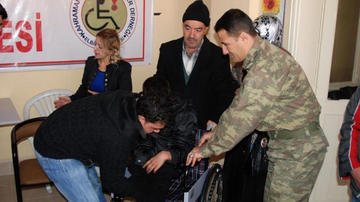 Elbistan İlçe Jandarma Komutanlığı, ilçede yaşayan engelli vatandaşlara 2 adet tekerlekli sandalye hediye etti. Komutan, el öpmek isteyen engellinin elini öptü ve kendilerini desteklediklerini ifade etti.