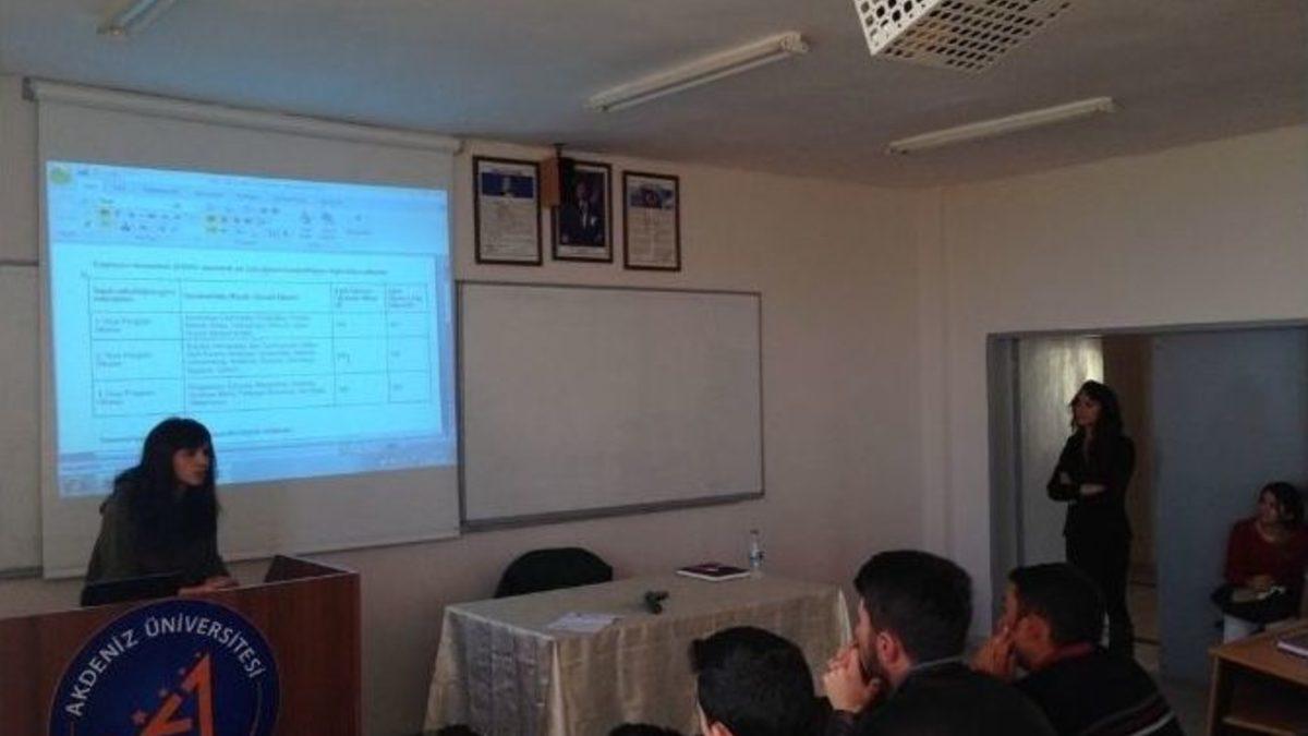 Akdeniz Üniversitesi (AÜ) Uluslararası İlişkiler Ofisi tarafından Elmalı Meslek Yüksekokulu’nda "Uluslararası Fırsatlar ve Erasmus Programı" konulu bilgilendirme semineri düzenledi.Erasmus Değişim Programı Sorumlusu Serap Yeter ve Mevlana Değişim Programı Sorumlusu Ayşe Tuğcan’ın konuşmacı olarak katıldığı bilgilendirme seminerine öğrenciler yoğun ilgi gösterdiler. Öğrencilere AB hibe Programları, Erasmus, Mevlana ve diğer öğrenci değişim programları hakkında bilgiler verilirken, Elmalı MYO Müdürü Halil Demir, okulda bin 300 öğrenci bulunduğunu belirterek, "Öğrencilerimizin mesleki gelişimleri yolunda katkı koyabilmek bizim için çok önemli" dedi.Akdeniz Üniversitesi’nin uluslararasılaşma konusunda hem öğretim elamanı, hem öğrenci değişimleri açısından önemli başarılara imza attığını kaydeden Demir, "Biz de MYO olarak öğrencilerimizi yurt dışına eğitim, staj gibi konularda göndermek istiyoruz. Az sayıda olan öğretim elamanı talebini de artırmayı hedefliyoruz. Bu konuda da yoğun talep alıyoruz. İnşallah başarılı olacağız. Bize destek olan başta Prof.Dr. Burhan Özkan olmak üzere Uluslararası İlişkiler Ofisi’ne teşekkür ediyorum." diye konuştu.