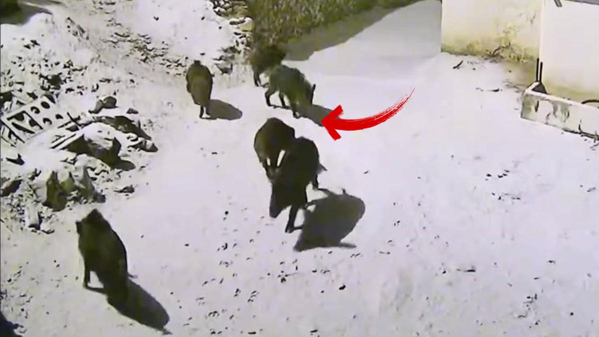 Elazığ’da kar yağışı sonrası doğada yiyecek bulmakta güçlük çeken domuzlar, Baskil ilçesi Hacıhüseyinler köyüne indi. Köyün içerisinde bulunan güvenlik kamerasına yansıyan domuz sürüsü bir süre sonra gözden kayboldu.