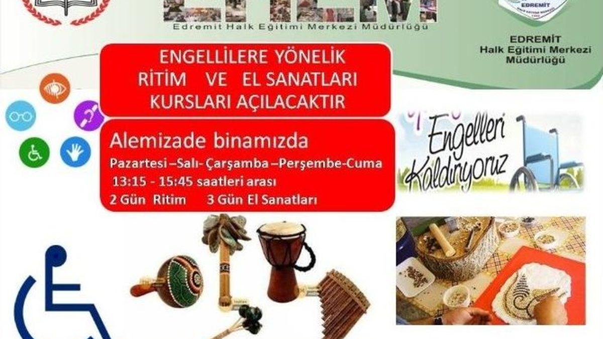 Edremit Halk Eğitimi Merkezi Müdürlüğü EHEM Özel Eğitim İhtiyacı olan bireylere yönelik olarak Mesleki ve Sosyal Kültürel Kurslar açmak için gerekli hazırlıkları tamamladı. Edremit merkezde Alemizade Kurslar Binasında açılacak olan kurslar için kayıt başvuruları alınmaya başlandı. Merkez Müdürü İsmail Damar tarafından yapılan duyuruda " Merkezimizce özel eğitime ihtiyacı olan engelli vatandaşlarımıza yönelik kurslar açılması planlanmıştır. Açılacak olan kurslarımız Darbuka-Ritim ve El Sanatları dallarında olacaktır. Hayat Boyu Öğrenme Genel Müdürlüğümüzce e-yaygın otomasyon sisteminde tanımlanabilen 765 farklı kurs açabilme imkanına sahibiz. Ayrıca sertifika programları dışında hayata dair her alanda sayısız seminer açılabilecektir. Önemli olan engelli vatandaşlarımızın ilgi ihtiyaç ve talepleridir. Eğitimlerin hafta içi günlerde 13:15-16:00 saatleri arasında gerçekleştirilmesi planlanmıştır. Talep gelmesi halinde 10:00-12:00 saatleri arasında da planlanabilecektir. Özel eğitim ihtiyacı olan bireylerin hayat boyu öğrenmeye katılımını sağlamak, sosyal yaşama katılımlarını artırmak öncelikli amacımızdır. Ücretsiz olan eğitimlere katlım için Millİ Eğitim Bakanlığı Taşıma Yoluyla Eğitime Erişim Yönetmeliğinin ilgili hükümleri kapsamında kursiyerler talep etmeleri halinde ücretsiz taşıma hizmeti verilebilecektir. Kursiyer sayı şartı aranmaksızın Ritim ve El Sanatları kurslarımız açılacaktır. Engelli bireylerin anne, baba yâda yasal vasileri engel türlerini beyan ederek kurs başvurularını Kurşunlu Camii yanında bulunan Halk Eğitimi Merkezi Müdürlüğüne gelerek başvuru formunu doldurmaları yeterli olacaktır. Normal bireylere yönelik eğitimlerin yanı sıra daha çok sayıda engelli vatandaşımızın verilen eğitim hizmetlerinden yararlanması öncelikli hedeflerimiz arasındadır. Spor dalları, Müzik, El Sanatları ve birçok meslek dallarında açılabilecek eğitimlerimiz için vatandaşlarımızı merkezimize bekliyoruz. Engel türlerine göre özel oluşturacağımız sınıflarda eğitimler gerçekleştirilecektir." dedi. Ayrıntılı bilgi ve başvuru için Halk Eğitimi Merkezine başvurulabileceği bildirildi.