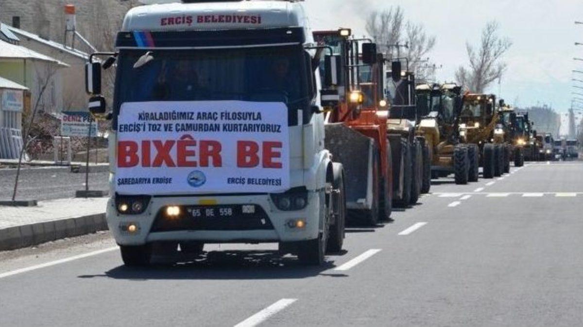 Van’ın Erciş Belediyesi, Van Büyükşehir Belediyesi ile VASKİ’nin ihale usulü ile ayrı ayrı kiraladığı 35 adet iş makinesi ve kamyon ile hâlihazırda bulunan araçlarla birlikte toplamda 78 adet aracın hizmet amaçlı iki ay boyunca ilçeye bağlı mahallerde çalışma yapacağı bildirildi.Kiralanan araçlar ile halihazırda bulunan araç parkının tanıtımı nedeniyle belediye önünde tören düzenlendi. Törende bir konuşma yapan Erciş Belediyesi Eş Başkanı Abdurrahman Çağan, seçildikleri dönemde halka verdikleri sözleri bir bir yerine getirmeye başladıklarını belirterek, iki aylık çalışma sezonu boyunca hizmet verecek araçların tüm Erciş halkına hayırlı olması temennisinde bulundu.Erciş Belediye Eş Başkanı Diba Keskin ise, bundan sonra daha çok hizmet üretmenin zamanı olduğunu belirterek, “Şimdi daha çok hizmet üretmenin zamanı. Büyükşehir yasası ile 100’e yakın köy mahalle statüsü kazanarak belediyemize bağlanması yükümüzü arttırdı. Ama daha çok çalışarak bunun üstesinden geleceğiz. Kiraladıklarımız araçlar ve belediyemize ait toplamda araç ve iş makinesiyle tüm mahallere iki ay boyunca hizmet vereceğiz. Ekiplerimizden ikisi köylerde, biri de şehir merkezinde olmak üzere üç ayrı koldan alt ve üst yapı çalışmalarına başlayacağız. Bu güzel bahar ayında startını vereceğimiz çalışma ile yıllardır ihmal edilen hizmetleri halka götüreceğiz. Çünkü biz güce, iktidara değil ilçemizde yaşayan tüm kesimlerle halkın kendisine dayandık. Halk için çalışmaya devam edeceğiz. Bize bırakılan eski para ile 182 trilyon borca rağmen, bu hizmetleri yapacağız. Ayrıca, mayıs ayında 10 adet otobüsün gelmesi ile birlikte de ulaşım sorununu uzun vadede çözeceğiz” dedi.Konuşmaların ardından araçlar hizmet üretmek amacıyla köylere gönderildi.