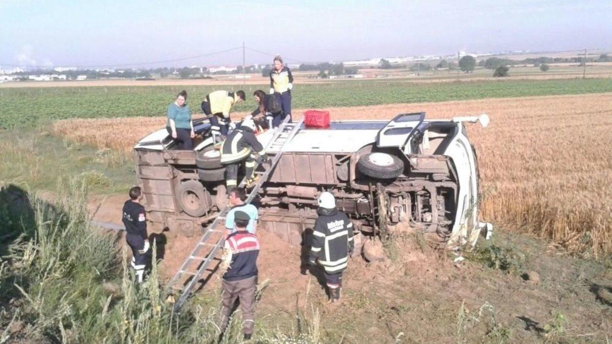 Tekirdağ’ın Ergene ilçesinde meydana gelen kazada devrilen fabrika servisinde bulunan işçilerden 18’i yaralandı.Edinilen bilgilere göre, kaza, Ergene’nin Ulaş Mahallesi Mevkii’nde meydana geldi. Çorlu şehir merkezinden aldığı işçileri Ergene ilçesi sınırları içerisinde yer alan bir fabrikaya götürmek üzere yola çıkan Olcay Çatma (41)idaresindeki 59 S 9185 plakalı servis minibüsü Ulaş Mahallesi Mevkii’ne geldiği sırada henüz belirlenemeyen bir sebepten ötürü sürücünün direksiyon hakimiyetini kaybetmesi sonucu yoldan çıkarak tarlaya devrildi.Kazada servis minibüsünde bulunan işçilerden Sülbiye Koşar, Kıymet Özer, Gülşen Sevim, Fadime Bağlı, Oya İnan, Özlem Üner, Aynur Kuloğlu, Muhlis Sarıgül, Sebahat Güler, Akife Buğu, Kübra Çakır, Hülya Çavuş, Dilek Demir, Yasemin Yıldırım, Cansu Eroğlu, İdris Üşkün ve Gamze Gül adlı işçiler yaralandı.Yaralı işçiler olay yerine ulaşan sağlık ekiplerinde yapılan ilk müdahalenin ardından Çorlu Devlet Hastanesi Acil Servisi’ne kaldırılarak tedavi altına alındı.Kazanın meydana geldiği yerde ise jandarma ekipleri inceleme yaptı.Olayla ilgili olarak başlatılan soruşturma sürdürülüyor.