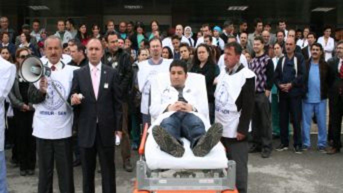 Şiddet gören bir doktorun temsili olarak sedyeye yattığı eylemde basın açıklaması yapıldı. Sedyede yatan doktor slogan atarak kendilerine yönelik yapılan şiddeti protesto etti.