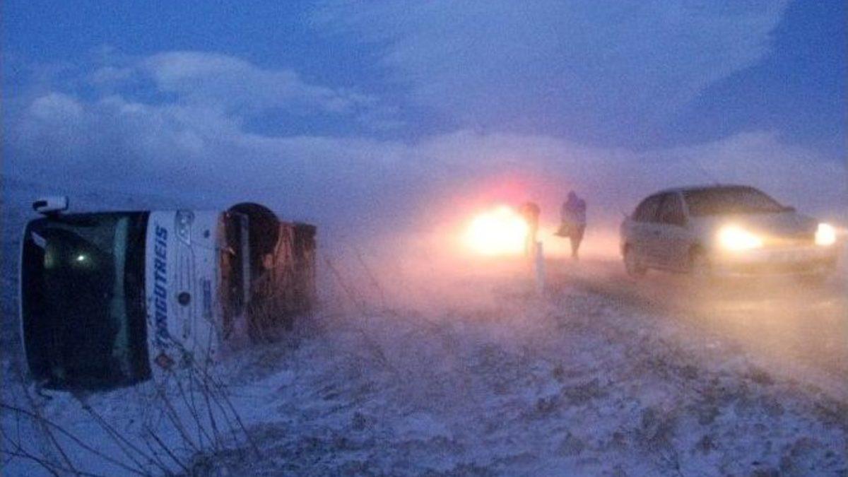 Erzurum’da zaman zaman hızı 100 kilometreyi bulan fırtına yolcu otobüsünü devirdi. 10 kişinin yaralandığı kazada otobüs içerisindeki yaralılar yoğun fırtına alında sağlık ekipleri tarafından güçlükle çıkarıldı.Erzurum’da kar, tipi ve fırtına hayatı adeta durma noktasına getirirken, Hamamderesi mevkiinde fırtına yolcu otobüsünü devirdi. Kars’tan İzmir’e gitmekte olan 36 003 özel plakalı yolcu otobüsü, fırtınanın etkisiyle devrilerek yolun kenarına yan yattı. Kazada 10 kişi yaralandı. Yoğun fırına altında yaralıları kurtarma çalışması adeta can pazarına dönüştü. Otobüs içerisinde kalan bir kadın yaralı sağlık ekipleri tarafından güçlükle çıkarılarak ambulansla hastaneye kaldırıldı.Trafik ekipleri kaza mahalinde incelemede bulunurken fırtına bu sırada ambulansın camını da patlattı.Kazayla ilgili tahkikat başlatıldı.