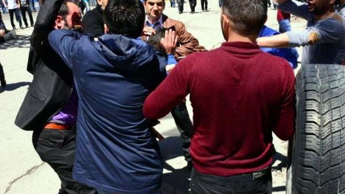 Mitingin yapıldığı İstasyon Meydanı'na giderken, göstericilerin arasında kalan bir kişi de tekme tokat dövülürken, ilçelerden gelen partilileri taşıyan bazı araçlar saldırıya uğradı.