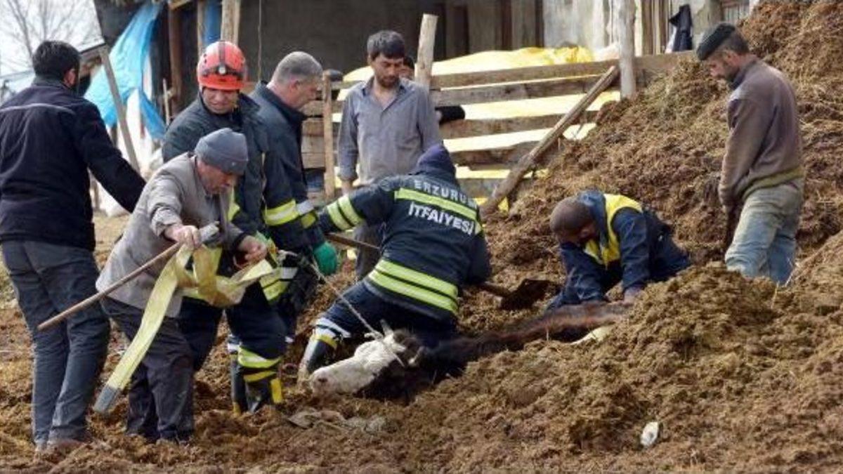 Turgay İPEK/ERZURUM, Merkez Yakutiye ilçesindeki hayvan pazarına getirilen inek dün bir anda sahibi Medeni Kırmaç'ın elinden kurtuldu. Ahırların bulunduğu yere kaçan inek, uzun zamandır biriken ve yüksekliği 3 metreye ulaşan hayvan pisliğinin içine saplandı. Sahibi ve vatandaşların çabaları yetersiz kalınca Büyükşehir Belediyesine bağlı itfaiye ekiplerinden yardım istendi. Kısa sürede olay yerine gelen itfaiye erleri ineğin etrafını küreklerle temizleyip, boynuzlarına bağladığı halatla çekmek istedi. Ancak ineğe zarar verilme ihtimali üzerine bu girişimden vazgeçildi. İtfaiye erleri, telsiz anonsu ile merkezden kepçe istedi. Gelen kepçe, ineğin etrafındaki pisliği temizledi. Uzun süre hareketsiz bekleyen ineğin ayaklarının uyuşması sonucu düştüğü yerden güçlükle ayağa kalkabildi. Yaklaşık 2 saat süren çalışma sonucu inek kurtarıldı.