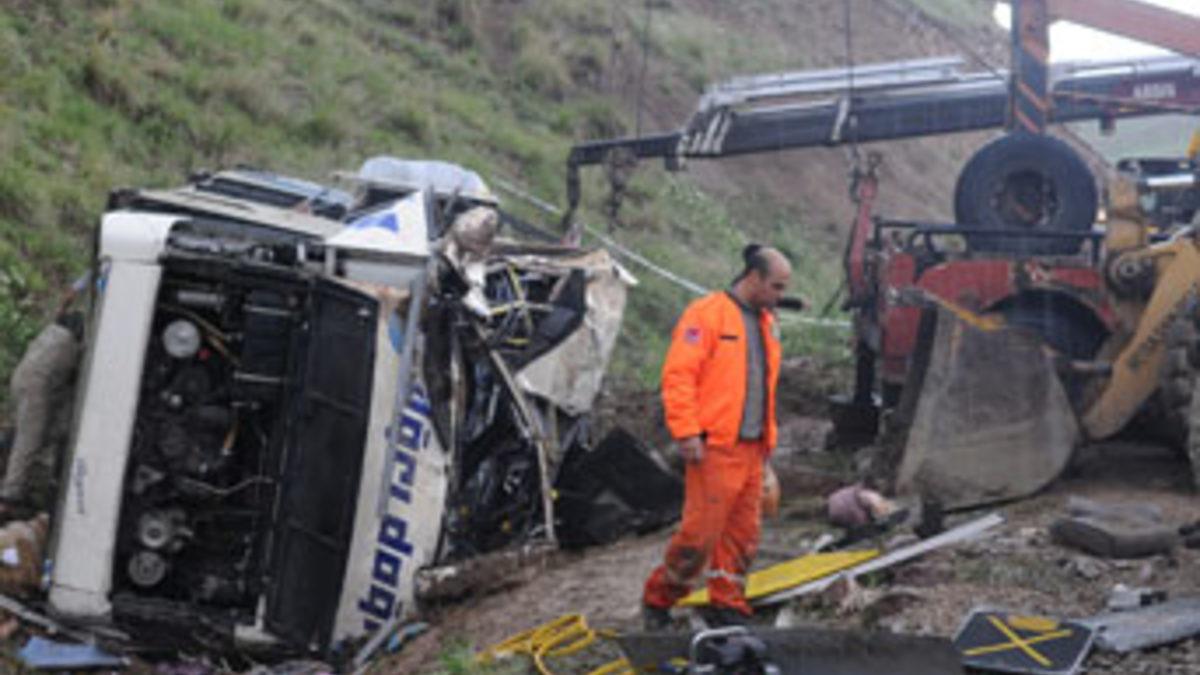 Öte yandan, şarampole devrilen ve bir kısmı toprağa gömülen otobüsün enkazının kaldırılması için de çalışma yapılıyor.