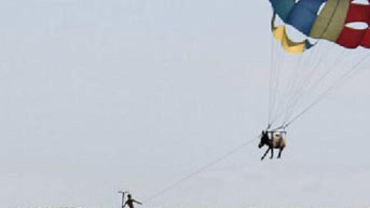 Temrük adlı plajda, reklam ve çevrede dinlenenlerin ilgisini çekmek amacıyla eşek paraşüte bindirilerek havada sallandırıldı.