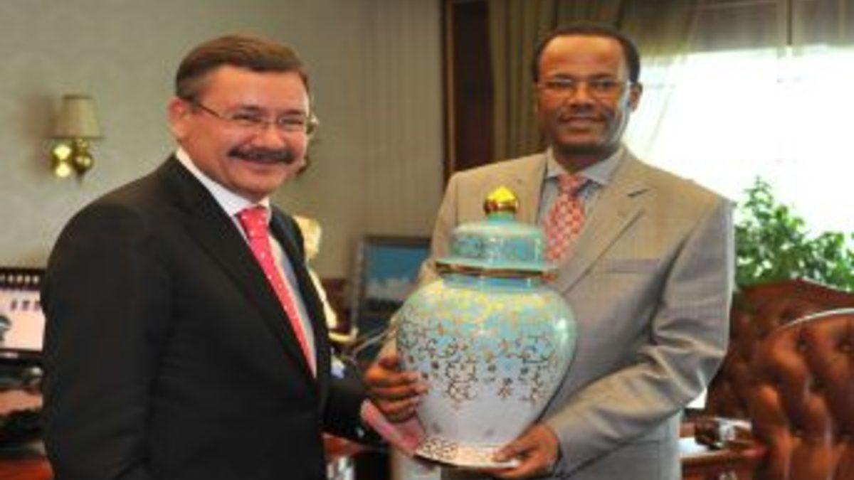 Etyopya’nın Başkenti Addis Ababa’nın Belediye Başkanı Kuma Demeksa He Tokon ve beraberindeki heyet, Büyükşehir Belediye Başkanı Melih Gökçek’i ziyaret etti. Başkanlık Konutu’nda gerçekleşen ziyarette Belediye Başkanı Kuma Demeksa He Tokon’un eşi Dibabe Eshetu ile Addis Ababa belediyesinin üst düzey görevlileri bulundu.