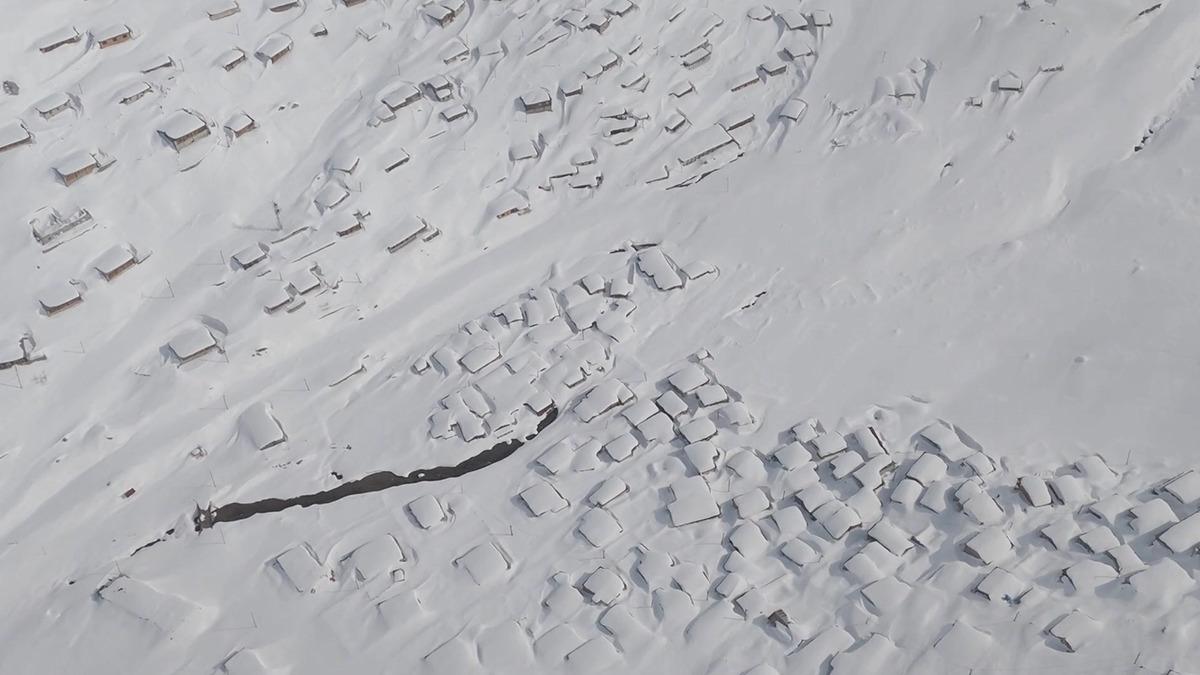 7 kişilik grup, kar kalınlığının yer yer ev seviyesini aştığı yaylada tulum ezgileriyle gezinti yaptı. Beyaz örtüyle kaplanan yayla, dron kamerasıyla görüntülendi.