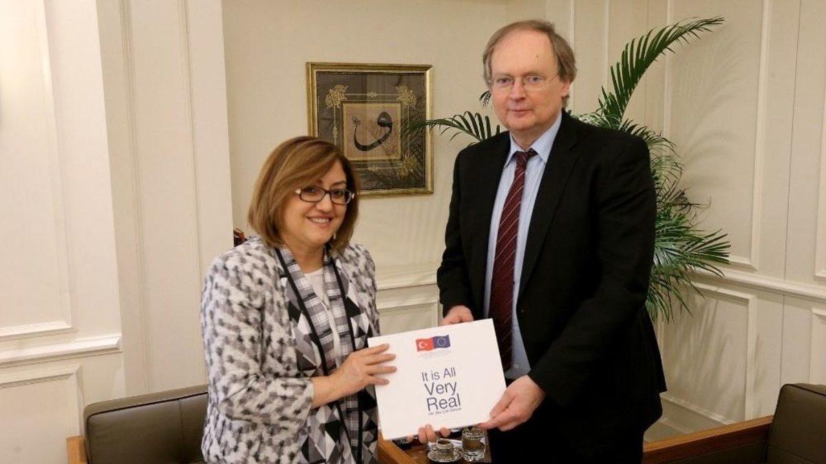 Gaziantep Büyükşehir Belediye Başkanı Fatma Şahin, Avrupa Birliği (AB) Türkiye Delegasyonu Başkanı Büyükelçi Christian Berger’i makamında ağırladı. Suriyeli mültecilere yönelik eğitim, istihdam ve sosyal entegrasyonun ele alındığı görüşmede, Büyükşehir Belediyesi ile AB arasında ortak projelerin geliştirilmesine vurgu yapıldı.Şahin, AB Türkiye Delegasyonu Başkanı Berger ile Suriyeli mültecilere dönük sorunların çözümünde ortak akılla hareket edeceklerini söyledi. Şahin, “Suriyeli mültecilerin eğitimi olmazsa olmazımız arasındadır. Ancak eğitimle birlikte istihdamı ve sosyal entegrasyonu güçlendiremezsek bu durumu sürdürülebilir hale getiremeyiz. Bu başlıklara da iyi çalışmamız gerekiyor. Günümüzde mesleki eğitim çok önemli bir hale geldi. Öğrencileri hem kayıt içerisine alma, hem de açık işe uygun sertifika programlarıyla onları istihdama hazırlamak eğitimin bir parçasıdır. Türkiye Belediyeler Birliği bünyesinde mültecilerin ağırlıkta olduğu belediyelerde kurulacak çatı kuruluşlarla AB delegasyonla daha senkronize çalışabilirsek bu konuda hızlanacağımızı düşünüyorum” dedi.Avrupa Birliği (AB) Türkiye Delegasyonu Başkanı Büyükelçi Christian Berger ise, Suriyeli mülteci meselesinde en fazla sıkıntıyı belediyelerin çektiğini kaydederek, “Yerel yönetimlere özellikle altyapı konusunda destek vermeye devam edeceğiz. Brüksel’de yaptığımız toplantıda Suriyeli mültecilerin eğitimi konusunda hem fikiriz, eğitimi önemsiyoruz. Hem okul yapmak hem de daha fazla kişiye ulaşarak onları eğitime katmak gerekiyor. Gaziantep Üniversitesi’nde 300 Suriyeli öğrencinin Türkçe öğrenmesini sağladık, eğitime odaklanıyoruz. Öğrencilere verilen eğitim sırasında hem mesleki, hem de yetenek geliştirme kapasitelerine odaklanırsak Suriyeli mülteciler, istihdamın parçası olacaktır” şeklinde konuştu.Konuşmaların ardından günün anısına Başkan Şahin ve Berger birbirine karşılıklı hediye verdi.