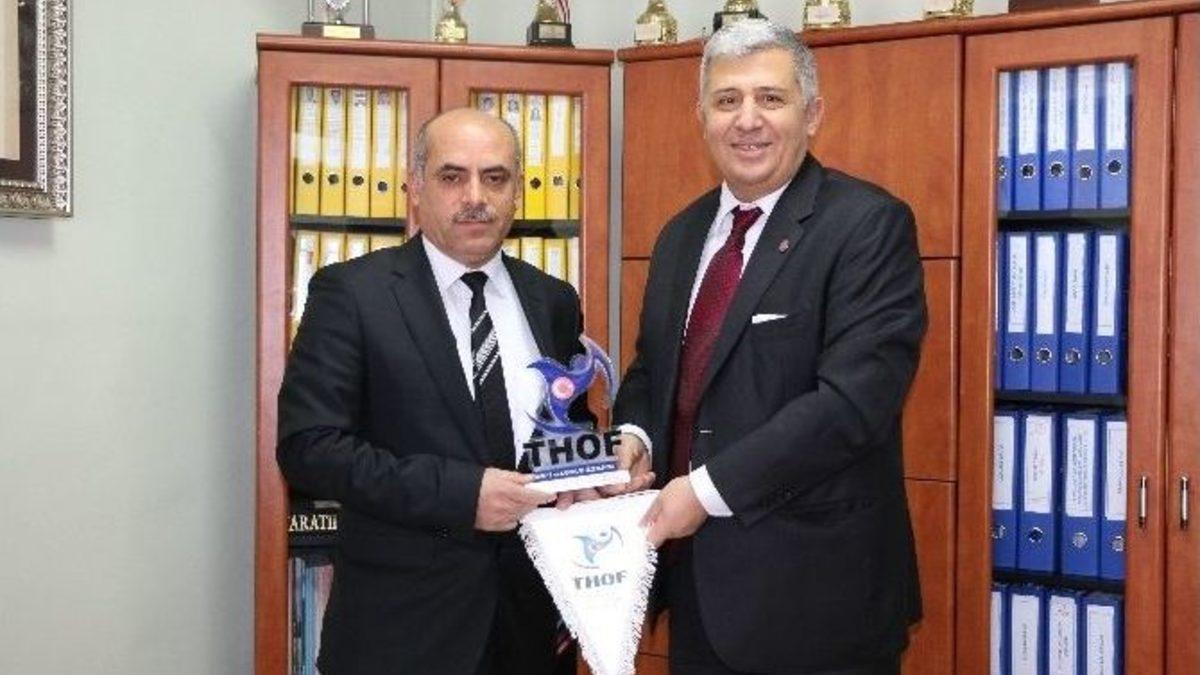 Türkiye Halk Oyunları Federasyon (THOF) Başkanı Hayri Gürhan Ozanoğlu, Battalgazi Halk Eğitim Merkezi Müdürlüğünü ziyaret etti.Ziyarete Türkiye Halk Oyunları Yönetim Kurulu Üyesi Kemal Deniz, İl Temsilcisi Metin Seçen, Battalgazi Halk Oyunları Antrenörü Mehmet Çakmak, Kurhan Spor Kulübü Başkanı Cemal Kurhan ile 2013 yılında Yıldızlar Türkiye Şampiyonası’nda Türkiye birincisi olan Kurhan Spor Kulübü Halk Oyunları Antrenörü Özge Çalışkan da katıldı. THOF Başkanı Hayri Gürhan Ozanoğlu, Battalgazi Halk Eğitim Merkezi’nin halk oyunları kurslarına verdiği destekten dolayı teşekkür ederek, kültürümüzün en önemli yaşayan değerlerinden, halk oyunlarının korunması, gelecek nesillere sağlıklı bir şekilde aktarılması, geniş kitlelere tanıtılıp, yayılması için desteklerinin devam etmesini istedi.Battalgazi Halk Eğitim Merkezi Müdürü Nurettin Gürsoy ise halk oyunlarının eğitimi, fiziksel aktivitesi ve müzik bütünlüğü ile öğrencilerin bedensel ve zihinsel gelişimine katkı sağladığını aktardı. Gürsoy, “Günümüzde halk oyunları, sahnenin bütün kadrolarından faydalanılarak sanatsal bir anlayış içerisinde sergilendiği gibi, spor salonlarında da sportif bir yaklaşım çerçevesinde yarışmalar organize edilerek varlığını sürdürmekte. Bu nedenle halk oyunları eğitimi, fiziksel aktivitesi ve müzik bütünlüğü ile öğrencinin bedensel ve zihinsel gelişimine yadsınmayacak katkılar sağlıyor. Sosyal, kültürel, sanatsal ve sportif özellikleriyle de eğitim sürecinde çok etkin bir rol oynuyor. Biz halk oyunlarının ne kadar önemli ve değerli olduğunu biliyoruz, bu yüzden de halk oyunları kursları bizim için ayrı bir öneme sahip” diye konuştu.Daha sonra Hayri Gürhan Ozanoğlu, Nurettin Gürsoy’a plaket ve hediye takdim etti.