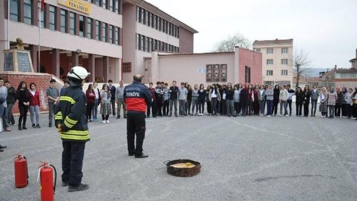 Bozüyük Belediyesi İtfaiye Müdürlüğü’nde görevli personel tarafından Fen Lisesi öğrencilerine uygulamalı yangın eğitimi verildi.Bozüyük’te kanal boyunda bulunan Fen Lisesi’nin bahçesinde yapılan eğitim çalışmalarına 9. ve 10. sınıf öğrencileri ile birlikte okul müdürü ve öğretmenler de katıldı. Eğitim çalışmasında öğrencilere yangın tüpünün ne olduğu ve nasıl kullanılması gerektiği anlatılarak, kullanımı uygulamalı olarak gösterildi. Yangın eğitiminin sonunda öğrenciler de, yangın tüpünü bizzat kendileri kullanarak yangın söndürme tatbikatı yaptı.