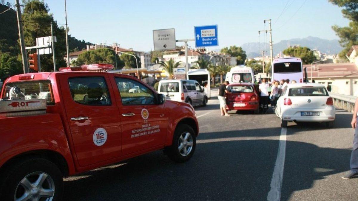 Muğla’nın Marmaris ilçesinde askeri üssün sivil personelini taşıyan bir midibüsün freni patladı. Sürücünün şarampole yuvarlanmamak için ışıkta bekleyen 5 araca çarparak durdurabildiği midibüste bulunan 16 kişi hafif yaralandı.Kaza bugün saat 07.30 sıralarında ilçe girişindeki kavşakta meydana geldi. İddiaya göre, Gökova’dan aldığı 27 sivil personeli Aksaz Deniz Üs Komutanlığına götürmekte olan Metin Gündüz (29) idaresindeki taşıma firmasına ait 48 M 4959 midibüsün ilçe girişine yaklaştığı sırada freni patladı. Midibüsü durduramayan sürücü önce kırmızı ışıkta bekleyen araçlardan birine çarptı. Çarpmanın etkisiyle 5 aracın karıştığı zincirleme trafik kazası meydana geldi. Hızı düşen midibüs güçlükle durabildi.Kazada, midübüste bulunan 9 yolcu ile zincirleme kazaya karışan 5 araçtaki 7 kişi hafif şekilde yaralandı. Yaralılar ambulanslarla Marmaris Devlet Hastanesine kaldırılarak acil serviste tedavi edildi. Kaza nedeniyle Marmaris -Gökova duble yolunda yaklaşık 8 kilometrelik araç konvoyu oluştu.