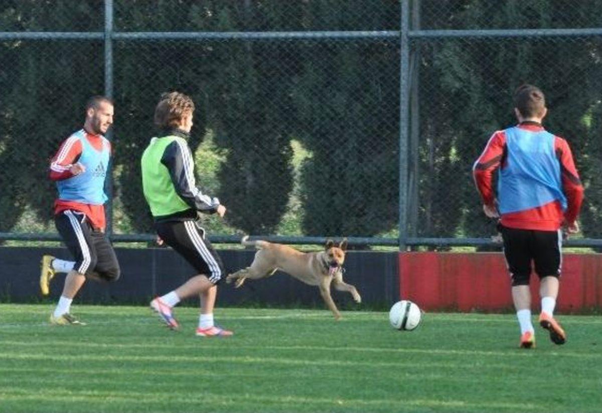 Pazar günü deplasmanda Fatura Vizyon Kahramanmaraşspor ile karşılaşacak kırmızı-siyahlılar, Irlamaz Tesisleri’nde haftanın ilk antrenmanı yaptığı sırada Turgutluspor’un forvet oyuncusu Ömer Kaplan’a ait Melo isimli köpek tasmasından kurtularak çift kale maç yapan oyuncuların arasına daldı.