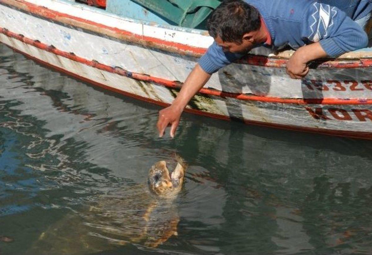 Fethiyeli balıkçıların ağ temizlerken attıkları yengeç ve küçük balıklarla beslenen iki caretta caretta türü kaplumbağa Fethiye’nin maskotu oldu.