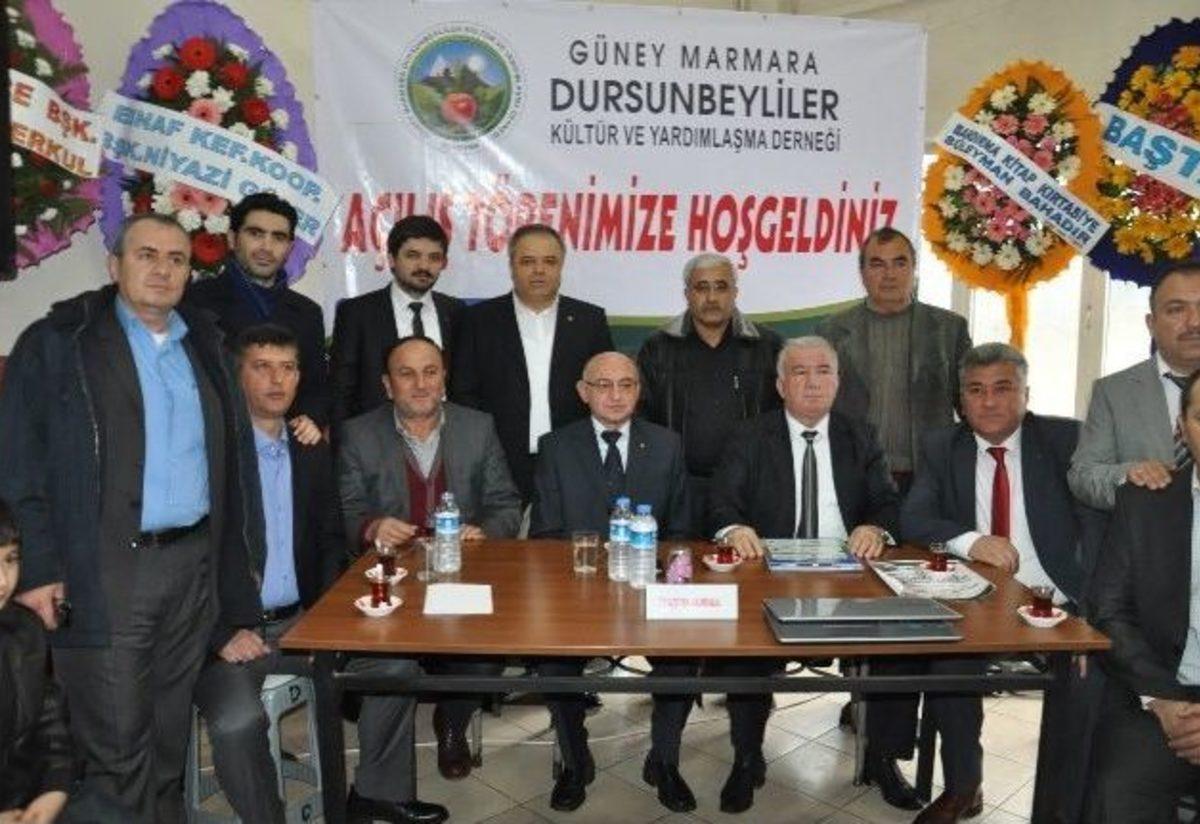 Balıkesir'in Bandırma ilçesinde yaşayan Dursunbeyliler, "Güney Marmara Dursunbeyliler Kültür ve Yardımlaşma Derneği" kurdu. Derneğin açılışına çok sayıda Dursunbeyli ve Bandırma'daki vatandaşlar katıldı.Balıkesir'in Dursunbey ilçesinden daha önceden çeşitli sebeplerle Balıkesir'in Bandırma ilçesine göç etmiş ve burada yerleşmiş Dursunbeyliler ilçede kendi ilçelerinin derneğini kurdu. Yaklaşık 18 bin Dursunbeyli vatandaşın yaşadığı Bandırma'da bir araya gelen Dursunbeyliler kurdukları derneği geniş bir katılımla açıp faaliyete geçirdi. Düzenlenen törene Bandırmalı olan AK Parti Balıkesir Milletvekili M. Cemal Öztaylan, Dursunbey Belediye Başkanı M. Ruhi Yılmaz, Bandırma Belediye Başkanı Sedat Pekel, Edincik Belediye Başkanı Mehmet Yağcı, İl Kültür ve Turizm Müdürü Mustafa Çaltı, Dursunbey Esnaf Odası başkanı Oğuz Çakırcalı ve yönetimi, Dursunbey Belediye Meclis Üyeleri Ramazan Kıymaz, İdris Ocaktan, Dursunbey, Balıkesir ve Bandırma’dan Belediye başkanlıklarına talip çeşitli partilere mensup başkan adayları, farklı illerde faaliyet gösteren Dursunbeyliler Derneklerinin yöneticileri ile binlerce Dursunbeyli katıldı. Bandırma Küçük Sanayi Sitesinde bulunan ve Dursunbeyli bir vatandaşa ait Sanayi Lokantasında gerçekleşen açılış töreni saygı duruşu ve İstiklal Marşı ile başladı. Dernek başkanı Dr. Cemal Esendemir Dursunbeyliler Derneğinin kuruluş amacının Dursunbeylileri bir çatı altında toplamak, sorunlara çözüm bulmak, acıları ve sevinçleri paylaşmak, kültür, gelenek ve görenekleri gelecek nesillere aktarma olduğunu belirtti. Esendemir, yapacakları çeşitli etkinliklerle üyelerin birbirleri ile tanışmalarını sağlayacaklarını böylelikle dayanışmayı en üst seviyeye taşıyacaklarını söyledi. Derneği çok zorluk ve engele rağmen kurduklarını belirten Esendemir, kendilerine destek olan dernek yönetimi ve emeği geçen herkese teşekkür etti.Başkan Esendemir’in ardından DUFAD başkanı Halil Erkek, Dursunbey Belediye başkanı M. Ruhi Yılmaz, Bandırma Belediye başkanı Sedat Pekel, İl Kültür Müdürü Mustafa Çaltı ve Balıkesir Milletvekili Cemal Öztaylan da söz alarak katılımcılara hitap ettiler.Konuşmaların ardından Dursunbey’in kültürel mirası olan DUFAD, katılımcılara unutulmaz bir gün yaşattı. Dursunbey’e has müziklerin ve halk oyunlarının sergilendiği programda protokol üyeleri de sahneye çıkarak halk oyunlarına eşlik etti. Davetlilere pilav ve ayran ikram edilen açılışın ardından törende bir araya gelen çok sayıda Dursunbeyli tanışma ve kaynaşma fırsatı buldu. Protokol üyeleri daha sonra derneğin çarşı merkezindeki dernek binasına geçerek burada incelemelerde bulundu.