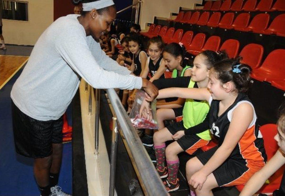 Canik Belediyespor oyuncuları, idman sonunda, kendilerini izleyen minik basketbolculara şeker ikram etti.