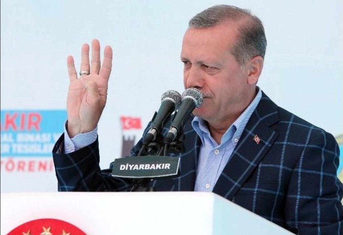 Cumhurbaşkanı Recep Tayyip Erdoğan Diyarbakır’da yaptığı konuşmada, "Hak ve özgürlüklerin genişletilmesi konusunda ’demokratik açılım’ dedik, biraz daha ilerlettik ’illi birlik ve kardeşlik projesi’ dedik. Son olarak ’Çözüm süreci’ dedik. Bundan da anlamadılar. Eş başkanlardan biri benim Kürt kardeşlerimi sokağa döktü. 53 kardeşimiz öldü mü? Er ya da geç bunların intikamı alınacak. Terör örgütü kuru kuruya silah bırakmayacak, gömecek ve betonlayacak. Ve bunların koordinatları da verilecek. Aksi takdirde bu ülkeyi terk etmek zorunda kalacaklar" dedi.Cumhurbaşkanı Recep Tayyip Erdoğan, eşi Emine Erdoğan, Başbakan Binali Yıldırım ile eşi Semiha Yıldırım, İçişleri Bakanı Efkan Ala, Kalkınma Bakanı Lütfi Elvan, AK Parti Genel Başkan Yardımcıları Mehdi Eker ve Çiğdem Karaaslan ile birlikte katıldığı Diyarbakır’daki 116 projenin toplu açılış töreninde konuştu.Terör örgütü PKK’nın, Dürümlü köyünde 15 ton patlayıcı yüklü kamyon ile 16 köylünün hayatını kaybetmesine yol açtığına dikkat çeken Cumhurbaşkanı Erdoğan, "Sevgili kardeşlerim bakınız PKK’nın desteklemiş olduğu bir parti şuanda parlamentoda mı? Onlar PKK adına parlamentoda. Şimdi benim milletim ne diyor? Bunlar bizim verdiğimiz vergilerle oradan maaş almamalı. Ne oldu şimdi dokunulmazlık olayı parlamentoya geldi. 376 oyla geçti. Şimdi tutuştular. Yurtdışına kaçmaya başladılar. Niye kaçıyorsunuz. Aynen Paralel Devlet Yapılanması neyse bunlar da o. Onlar da kaçıyor, bunlar da kaçıyor. Ben Dürümlü’deki saldırıda hayatını kaybeden vatandaşlarımıza Allah’tan rahmet, yakınlarına başsağlığı diliyorum. Dünkü gazetelerde Diyarbakırlı işadamlarımız adına yayınlanan ve bu olayı kınayıp, örgütün kayıtsız şartsız silah bırakması, yalnız kuru kuruya silah bırakmak değil, gömecek ve betonlayacak. Ve bunların koordinatları da verilecek. Yoksa bunlar bu işe çok alışıktır. Silahı bırakırlar, bir müddet sonra da gelir alırlar. Bu oyuna asla gelmeyiz. Olmadı. O zaman bu ülkeyi terk etmek zorunda kalacaklar. Bakınız Diyarbakırlı işadamlarımızın bu ilanları gerçekten örnektir. Ben de memnuniyetle bunu okudum. Bölge halkının bu şekilde açık tavır alması halinde örgütün eylem yapacak gücü ve imkanını kaybedeceğine inanıyorum" dedi."BU ÖRGÜT İNSANLIK İLE YANYANA DÜŞÜNÜLEMEZ"Temmuz’dan bu yana bölge halkının terör örgütünün de, parti, dernek gibi adlar altında uzantısı olarak çalışan yapıların da gerçek yüzünü gördüğünü vurgulayan Erdoğan, "Masum insanları paramparça ederek, katleden bir örgüt ne bu toprakların ne de ülkenin bir parçası olamaz. İnsanların yaşadıkları evleri buzdolabından yatağına, Kur’an’ı Kerim’inden ayakkabısına kadar bombalarla tuzaklayan örgüt ile bölge halkının en küçük bir ilişkisi olamaz. Vatandaşlarımızın günlük hayatının parçası olan binaları, araçları, keyfi şekilde tahrip eden, yolları keserek TIR’ları yakan, yıkan böyle bir örgütü bırakın Kürt kardeşlerimiz, insanlıkla yan yana düşünmek mümkün değildir. Terör örgütünün asıl hesaplaşması devletle değildir, bölge halkının inancı, kitabı, tarihi ve kültürüyledir. Örgüte destek verenler silahlı mücadeleden çok bölge halkını köklerinden koparmayı değerli görüyorlar" diye konuştu."OPERASYONLAR SONUNA KADAR DEVAM EDECEK"Terör örgütü PKK’nın infaz ettiği militanlarının ve masum insanların sayısının devletin operasyonlarında hayatını kaybedenlerden çok fazla olduğuna işaret eden Cumhurbaşkanı Erdoğan şu ifadeleri kullandı:"Geçmişteki faili meçhullerden söz edenler örgütün faili belli cinayetlerine de tepki koymadıkları sürece samimi olamazlar. Terör örgütünün vahşetini onu destekleyen sivil görünümlü yapıların yol açtıklarını perdelemek için söylenen sözler havada kalmaya mahkumdur. Biz darbecilere karşı verdiğimiz mücadele ne kadar samimi isek terör örgütüne ve güdümündekilere verdiğimiz mücadelede de o kadar samimiyiz. Kandan beslenen bir canavara dönüşen bu örgütün tüm unsurları ile birlikte Diyarbakır’dan, bölgemizden ve ülkemizden uzaklaştırılması şarttır. İşte bu operasyonlar onun için yapılıyor ve sonuna kadar da yapılacak. Benim Diyarbakırlı, Şırnaklı, Hakkarili kardeşim huzur buluna kadar bunlar devam edecek. Nerede olursa olsun elinde silah ile ortaya çıkan herkes karşısında sadece güvenlik güçlerimizi bulur. Biz en başından beri meselelerimizi demokrasi, insan hakları, özgürlük gibi hepimizin özlemi, arzusu olan ilkeler çerçevesinde konuşmanın çözmenin gayreti içerisinde olduk. Bölge insanın yaşadığı sıkıntıları çok yakından bilen biri olarak sorunları çökmek için her türlü çabayı gösterdik. 13 yılda 280 katrilyon liralık yatırım yaptık Doğu ve Güneydoğu’ya. Niye? Söz vermiştik. ’Batıda ne varsa Doğu’da da Güneydoğu’da da o olacak’ dedik. Yolu, elektriği, suyu ve sağlık tesisi olmayan yerleşim yerleri bırakmadık. Üniversite mi vardı bu bölgede. Biz açtık. Artık benim doğulu kardeşim kendi ilinde de üniversitesini okuyabiliyor. Sosyal yardımlarla bölgede yaşayan vatandaşlarımızdan hiç kimsenin aç ve açıkta kalmamasını sağladık. Hak ve özgürlüklerin genişletilmesi konusunda ’demokratik açılım’ dedik, biraz daha ilerlettik ’milli birlik ve kardeşlik projesi’ dedik. Son olarak genişleyip, ’çözüm süreci’ dedik. Bundan da anlamadılar. Eş başkanlardan biri benim Kürt kardeşlerimi sokağa döktü. 53 kardeşimiz burada öldü mü? Yasin Börü kardeşimiz öldü mü? Kurban eti dağıtıyordu. Ya bunlarda vicdan diye bir şey yok. İnsanlıktan nasibini almamış bunlar. Er ya da geç bunlardan
