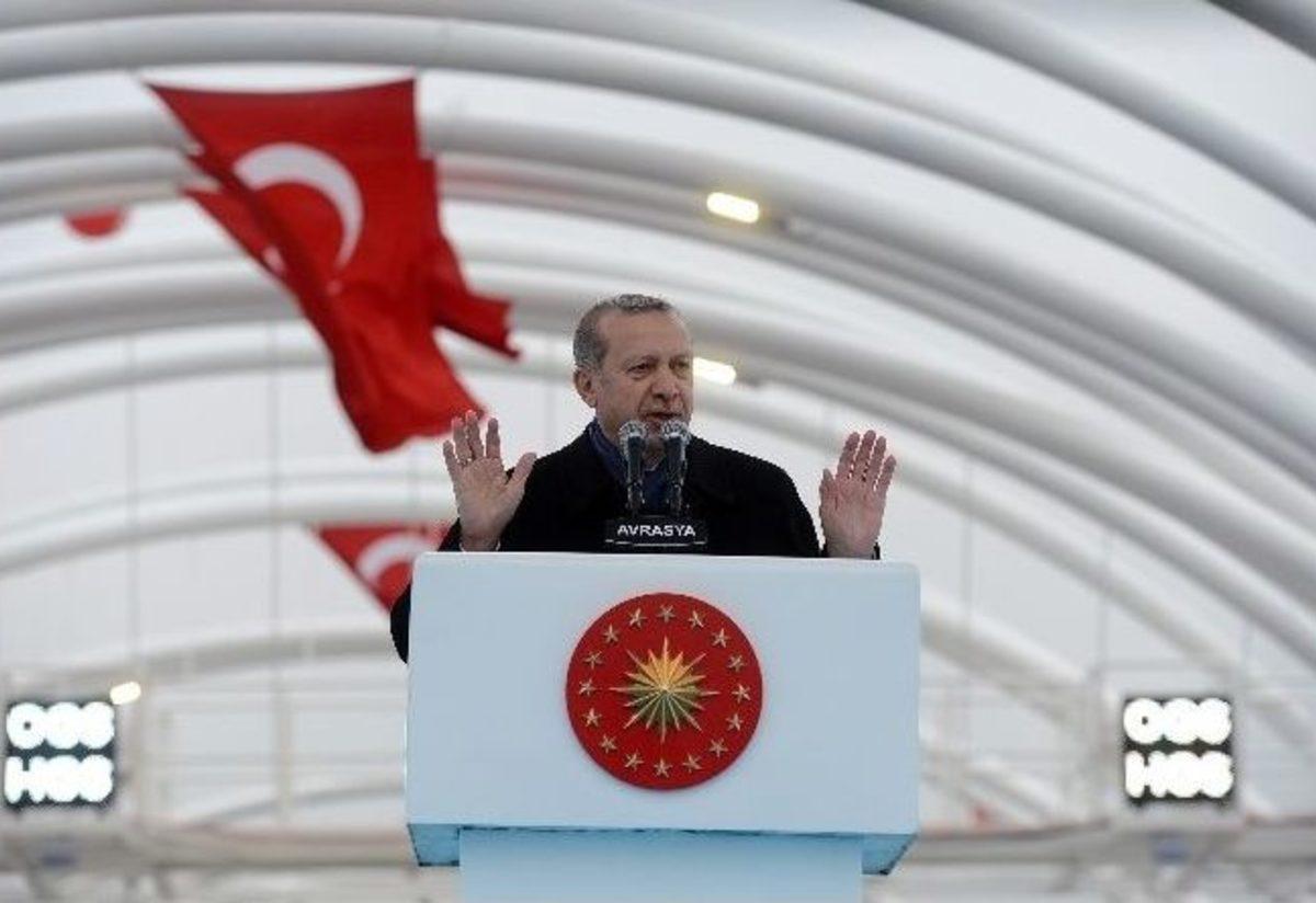Cumhurbaşkanı Recep Tayyip Erdoğan polis ve askerlere yönelik terörist saldırılara dikkat çekerek, "Terör örgütlerinin hedefinin asker, polis, korucu olması bu saldırıları meşrulaştırmaz. Maalesef bu yönde bir algı çalışması var. Bizim anlayışımıza göre katil katildir, terörist terörist. Teröristin nereyi hedef aldığının, hangi silahı tercihe ettiğinin ne önemi olabilir" dedi.Cumhurbaşkanı Recep Tayyip Erdoğan, Avrasya Tüneli açılışında konuştu.Terör olaylarına tepki gösteren Erdoğan, “Terörün bizi kendi gündemine esir etmesine izin vermedik, vermeyeceğiz. Onun için bugün burada bu eserin açılışının yapılmasın dedik ki ertelemeyeceğiz. Bunun teröre karşı en doğru ve en etkili tutum olduğuna inanıyorum” diye konuştu.Avrasya Tüneli’nin yaklaşık 4 yılda inşa edilmiş ve kendi alanında pek çok ilkler kullanılarak tamamlandığını söyleyen Erdoğan, “Henüz proje safhasında birçok ödül alan bu eserin, hizmete girdikten sonra daha büyük ilgi göreceğine inanıyorum. 1 milyar 245 milyon dolar. Günde yüz bin araç dışarıdaki hayat şartlarından etkilenmeden rahat şekilde burayı kullanacak. Artık fırtına çıktı, vapur seferleri iptal oldu, sis çöktü gibi haberleri geride bırakıyoruz. Bir taraftan Marmara, bir taraftan Avrasya tüneli. Bu eser için devletin kasasından tek kuruş çıkmamıştır. İş bilenin kılıç kuşananın. Tünelin inşasını ve işletmesini üstlenen firmalar, bir bölümü öz kaynak, bir bölümü kredi olarak finansmanı kendileri sağlamıştır. Yaklaşık 25 sene boyunca hazine yaklaşık 180 milyon TL gelir getirecek tünelin işletmesi, bu sürenin sonunda tamamen devlete geçecek. Harem ve Çatladıkapı arasındaki tünel sayesinde Kazlıçeşme-Göztepe 15 dakikaya iniyor. Bu sayede zamandan ve yakıttan yapılacak tasarrufu sizlerin takdirine bırakıyorum. İlk etapta sabah 07.00 aksam 21.00 arası hizmet verecek tünel, gerekli düzenlemeler yapıldıktan sonra 30 Ocak itibariyle 24 saat işletmeye geçecektir. Avrasya Tüneli ile ülkemiz Marmaray, Yavuz Sultan Selim Köprüsü gibi dünya çapında eser zincirine bir yenisini eklemiştir” diye konuştuBir sonraki hedefin Kanalistanbul olduğunu ifade eden Erdoğan, “İnşallah Karadeniz’i Marmara’ya bağlayacağız. Bu da dünyada ilklerden biri olacak. Türk insanı buna layık. Dünyadaki bu yarışta biz varız. Kanalistanbul ve Çanakkale köprüsü projelerimizi inşallah şu anda hayata geçirmenin hazırlığındayız. 18 Mart’ta Çanakkale köprüsünün temelini atıyoruz. Önümüzdeki yıl içinde da Kanalistanbul’la ilgili temel atma noktasına geleceğiz. Yeni Havalimanımızı önümüzdeki yılın Şubat ayında dünyanın bir numaralı havalimanın açılışını yapıyoruz. Hızlı tren, liman, baraj gibi projelerdeki çalışmalar tüm hızıyla devam ediyor” şeklinde konuştu.Yaşanan terör eylemlerine tepki gösteren Erdoğan, “İstediğiniz kadar terör estirin. İstediğiniz kadar alçakların bir araya getirin, bu milleti bölemeyeceksiniz. Bu milleti parçalayamayacaksınız. Türkü ile Kürdü ile, Lazı ile Çerkezi ile, 80 milyon bir olacağız, iri olacağız, diri olacağız, hep birlikte Türkiye olacağız. Bu milletin o terörist alçaklara boyun eğmedi, eğmeyecektir. Bunu Çanakkale’de gösterdi, Kurtuluş savaşında gösterdi. En son bunu 15 Temmuz’da gösterdi. Sizler tankların üzerine imanınız ile yürüdünüz. Sizin elinizde bayraktan başka, yüreğinizde imanınızdan başka bir şey yoktu. Dün akşamki alçak gibi alçakla tanklarla, toplarla savunmasız insanlara saldırdılar. O namussuzlar da uçakla vurmaya kalktılar, helikopterlerle vurmaya kalktılar, ellerindeki silahlarla vurmaya kalktılar” ifadelerini kullandı.“Zaten bağlantılar çıkmaya başladı”Dün Ankara’da Rusya Büyükelçisi’ne yönelik suikaste de değinen Erdoğan, “İşte dün akşamki kalleş de geldi ülkemizdeki bir yerde Rusya’nın temsilcisi olan bize emanet olan insanı sırtından vurdu. Sırtından vurmak kalleşlerin adetidir. Alçakların adetidir. İşte bunu yaptılar. Dün akşamki tabii bedelini anında ödedi ama bağlantıları bunların hepsi inceleniyor, araştırılıyor. Bunları da çıkaracağız. Zaten bağlantılar çıkmaya başladı” dedi.“Türkiye hem terörle mücadele edecek, hem de hedeflerine yürüyecek imkana sahip”Türkiye’nin 2023 hedeflerine taviz vermeden ilerlediğine dikkat çeken Erdoğan şunları söyledi;“Ülkemize yönelik saldırıların en önemli amaçlarından birinin bizim enerjimizi ve dikkatimizi hedeflerimizden uzaklaştırmak olduğunu biliyoruz. Türkiye’nin dünyanın en büyük 10 ekonomisinden biri haline gelmesi durumunda bölgesinde ve dünyada güç dengelerine nasıl bir etki yapacağının herkes farkında. Terör örgütleri üzerinden bizim ayağımıza pranga vurmaya çalışanlara mesajım şudur. Türkiye hem terörle mücadele edebilecek, hem de taviz vermeden hedeflerine yürüyecek imkana sahiptir. Ama nasıl tek millet, tek bayrak, tek vatan, tek devletle”"Terör örgütlerinin hedefinin asker, polis korucu olması bu saldırıları meşrulaştırmaz"Cumhurbaşkanı Erdoğan asker ve polislere yönelik terör saldırılarını da hatırlatarak, şöyle konuştu;“Eskiden dağda eylem yapan teröristler, şimdi şehirlere indi. Hatta Rusya Büyükelçisi’nde olduğu gibi misafirlerimizi hedef almaya başladı. Güvenlik güçlerimiz teröriste dağda inlerinde nefes aldırmayınca, terörün en sinsi biçimi olan sokaklarda caddelerde bombalı eylemler, suikastler devreye sokuldu. FETÖ darbe girişiminde de meydanlardaki insanlarımız hedef alınmıştı. DEAŞ ve PKK terör örgütleri de güya belli hedeflere yönelik gözüken ama vatandaşlarımızın hayatına kasteden eylemler yapıyorlar. Saldırıya uğrayan otobüslerin, binalar
