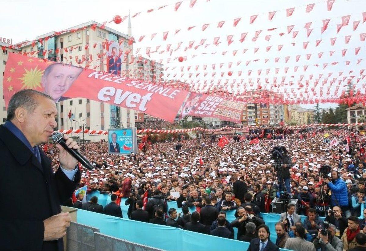 Cumhurbaşkanı Recep Tayyip Erdoğan, İsviçre’de tartışmalara konu olan poster ile ilgili olarak “Ne diyorlar; ‘Erdoğan’ı öldürün.’ Vah dangalaklar vah. Siz kim oluyorsunuz. Biz ölümü korkutmuş bir nesiliz. Biz kefenlerimizi giyerek yola çıktık. Biz gökten zembille inerek gelmedik buralara. 40 yıllık siyasi hayatımızda bir mücadeleden geçerek geldik. Silahlarla sandıklardan çıkmadık” dedi.Cumhurbaşkanı Recep Tayyip Erdoğan, 16 Nisan’da yapılacak referandum öncesinde yaptığı yurt gezileri kapsamında Rize’ye geldi. Rize Valiliği önünde on binlerce hemşehrisine seslenen Erdoğan, “Bu milletin iradesi ile sandıklardan çıktık ama Avrupa’daki bazı liderler ne yazık ki orada terör örgütlerini besliyor, İsviçre’de besliyor. Sosyalist parti İsviçre polisinin korumasında bu gösterileri yapıyor gün ola harman ola” ifadelerini kullandı.16 Nisan sonrası idam için referandum sinyali“Milletin emanetini FETÖ’nün hain sürüsüne, bölücü terör örgütünün hainlerine asla teslim etmeyiz” diyen Erdoğan, “Davalar görülmeye başladıkça FETÖ’cü sapkınların ne kadar bir hain oldukları ortaya çıkıyor. 16 Nisan’da bu işi ’evet’le bitirdiğimiz zaman Kılıçdaroğlu ne diyor ‘ben idama varım’ diyor. Bahçeli de kararını açıkladı, Yıldırım’ın da kararını biliyorum. Parlamentodan geçtiğinde önüme geldiğinde ben bunu onaylarım. Ne diyorlar ‘siz böyle diyorsunuz ama Avrupa Birliği buna bakmaz.’ George ne der, Hans ne der, Olga ne derse desin ben Ahmet ne der, Mehmet ne der, Hasan Hüseyin ne der, Ayşe Fatma ne der, ben buna bakarım. Allah’ım ne der ben buna bakarım ve bu işin de kararını milletimle beraber vereceğiz. Gerekirse al sana bir referandum daha yine gideriz. Ne çıkar referandumdan onu da biliyorum” şeklinde konuştu.Erdoğan, konuşmasına şöyle devam etti:“Milletimizle en ufak bağlantısı olan biri elinde bayrak dilinde dua olan silahsız ve savunmasız vatandaşları katleder mi? Ama bunlar etti mi? Etti. 15 Temmuz’da benim o vatandaşımın elinde ne vardı? Silah mı vardı? Bayrak vardı bayrak birde kelime-i şehadet vardı. Ve gökten F16’lar bomba yağdırırken helikopterler mermi yağdırırken, tanklar, toplar benim vatandaşımın üzerine gelirken o beğenmedikleri gençler o tankların önünde dururken, bunlar ne zannediyordu acaba? FETÖ diyordu ki; ’siz onların üzerine gidin bak onlar nasıl dağılacaklar.’ Dağıldılar mı? Çünkü o FETÖ bu milletin İstiklal Marşını bile bilmiyor. Ne diyor İstiklal Marşı’nda; ’Arkadaş yurdumu alçaklara uğratma sakın/siper et gövdeni dursun bu hayasızca akın.’ İşte gençler o gece göğüslerini siper ettiler. Bu millete canım feda bu milletin bir ferdi olmaktan iftihar ediyorum, gururluyum. Rabbime sonsuz hamd-ü senalar olsun ki bu kardeşinizi de bu milletin bir ferdi olarak yarattı.”“Şu ana kadar Avrupa’da 520 bin kardeşimiz oyunu kullandı; son seçimlerde 430 bin kardeşimiz oy kullanmıştı”"Söyle bana arkadaşını, söyleyeyim sana kim olduğunu" diyen Erdoğan, "Sen ülkemizi bölmek, parçalamak isteyenlerle beraber misin? Onlarla beraber haşrolacaksın. Söyle bana arkadaşını söyleyeyim sana kim olduğunu. Olay bu kadar basit. Ama bazen göz var, görmüyor. Kulak var duymuyor. Dil var hakikati söylemiyor. Çünkü onların gönülleri mühürlü. Bazı Avrupa ülkeleri savundukları ne kadar değer varsa onları ayakları altına alarak bu seferberliğe katkı sağlıyor. Bakanlarımıza kapıları kapatmaktan, demokratik haklarını kullanan gurbetçilerimize atlarıyla, itleriyle saldırmaya kadar her yola başvurdular. Şimdi de şehirlerinin en merkezi meydanlarını malum o dayatmacı, baskıcı faşizan baskı ile devam ettiriyor. Evet için 3 kişinin dahi bir araya gelmesine izin vermezlerken, hayır kampanyası yapan herkese en büyük salonlarını tahsis ettiler. Devlet televizyonları, yüksek tirajlı gazeteleri, uluslararası dergileri her gün en ağır hakaretlerle bize saldırıyorlar. Hiçbir şey olmaz. Ben milletimize güveniyorum, halkımıza güveniyorum. Hakka güveniyorum. Türkçe manşet ata ata dilimizi de öğrendiler. Türkçeyi baya öğrendiler. Ne kadar çirkefleşirlerse çirkefleşsinler, nafile. Milletimiz onlara cevabını demokrasiye uygun şekilde sandıkta verecek. Avrupa’da kardeşlerimiz daha öncedeki seçimlerde görüldü ki bir heyecanla sandığa koşuyor. Aman sandığı ihmal etmeyin. Sandıklara çok gideceksin. Şu mazeretim vardı, bu mazeretim vardı yok. Sandıkları patlatacaksın. Şu ana kadar 520 bin kardeşimiz oyunu kullandı. Son seçimlerde 430 bin kardeşimiz oy kullanmıştı. Bu önemli bir rakam. Kalan 6 günde sandıklara sahip çıkacaklarına, oylarıyla demokrasi düşmanlarına gerekli dersi vereceklerine inanıyorum" dedi.“Müslüman aynı delikten iki kere sokulmaz”“Müslüman aynı delikten iki kez sokulmaz” diyerek konuşmasını sürdüren Erdoğan, şunları kaydetti:“Biz yönetim sistemimizin zaafları nedeniyle değil 2, belki 22 defa sıkıntıya düşmüş ülkeyiz. Artık bu sistemde direnmenin manası kalmamıştır. Çıkmış, ’bir gece kalkar hemen ertesi gün muhtarlıkları kapatır’ diyor. Dürüst ol muhtarlık kararname ile kurulmuş bir makam değildir. Muhtarlar anayasa teminatı altında kanunla seçilirler. Seçimle geldikleri için seçimle giderler. Muhtarlar kararname ile gelmiyor. Kanunla geliyor. Ama bu adam ne anayasayı biliyor, ne kanunu bilir ne şu 18 maddeyi okumuş. Ana muhalefetin başında böyle birisinin olması bizim için iyi. Çünkü anında millet dersini veriyor. 7 seçime girdi 7’sini de kaybetti. Hala utanmadan sıkılmadan oranın başında duruyor. ’Batı, Batı, Batı’ diyorsun Batı’da 2 seçim kaybeden bir daha partisinin başında durmaz çeker gider. Türkiye’nin cumhu