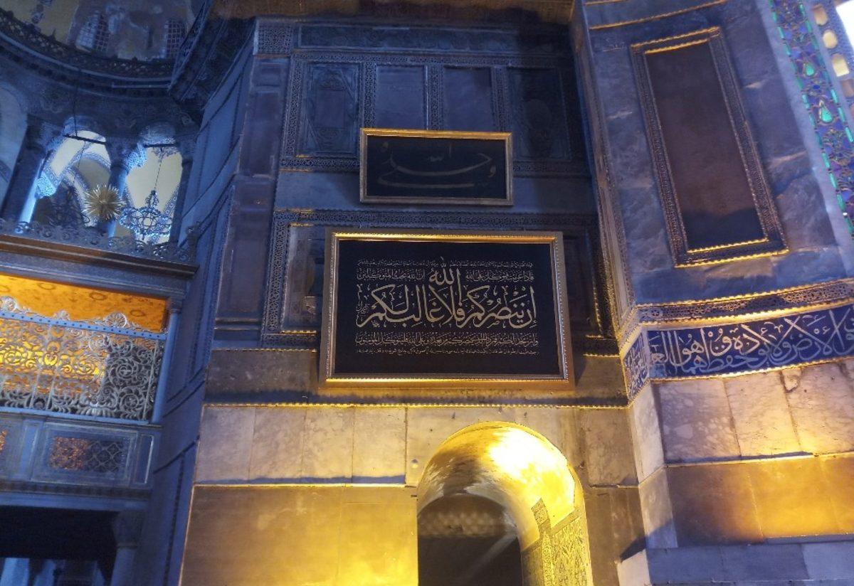 Cumhurbaşkanı Recep Tayyip Erdoğan’ın Ayasofya-i Kebir Cami-i Şerifi için bağışladığı ve üzerinde Al-i İmran Surelerinin 159’uncu ve 160’ıncı ayetlerinin yazılı olduğu hat tablosu görüntülendi.86 yıl sonra yeniden ibadete açılan Ayasofya-i Kebir Cami-i Şerifi için Cumhurbaşkanı Recep Tayyip Erdoğan tarafından özel hazırlanan hat tablosu cami içinde görüntülendi.