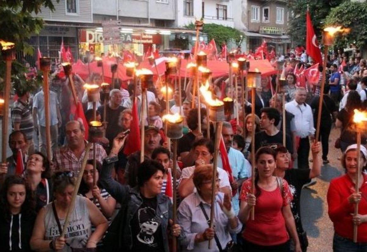 Uzun zamandır fener alayı gerçekleştirilmeyen ilçe merkezindeki fener alayı etkinliğini, ilçeye bağlı Zeytinli Belediyesi organize etti. CHP İlçe Teşkilatı ve belde teşkilatlarının da katılım desteği verdiği fener alayı, ilçenin Gümrük Meydanı’ndan başlatıldı. Ellerinde Türk bayrakları ve meşaleler bulunan ve çoğunluğunu kadınların oluşturduğu yaklaşık bin 500 kişilik grup, “Ulusal bayraklar engellenemez” şeklinde slogan attı. Dev Türk bayrağını taşıyan bayanlar, korteji evlerinden ve iş yerlerinden izleyen vatandaşlardan alkış topladı. Çalınan müzik ve 10 Yıl Marşı eşliğinde yürüyüşe geçen kortej, Çayiçi Caddesi’ni takiben Cumhuriyet Meydanı’na kadar ilerledi. Cumhuriyet Meydanı’nda son bulan yürüyüşün ardından, meydanda meşaleler yakıldı ve saygı duruşunda bulunulup İstiklal Marşı söylendi.