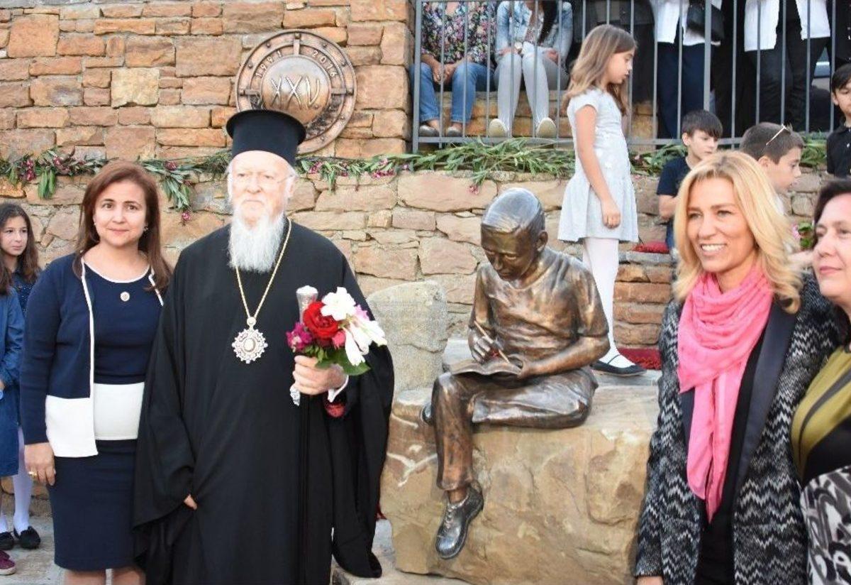 Çanakkale’nin Gökçeada ilçesinde Fener Rum Patriği Bartholomeos, öğrenim gördüğü Rum ilkokulunda kendisinin tasvir edildiği heykelin açılış törenine katıldı.Bir dizi temaslarda bulunmak için Gökçeada’ya gelen Fener Rum Patriği Bartholomeos, doğduğu Zeytinliköy’de 1946-1952 yılları arasında eğitim gördüğü Rum ilkokulunda yapılan heykelinin açılış törenine katıldı. Mimar Fulin Muslubaş Güzeldere ve Helkeltraş Pınar Cauoki tarafından Patrik Bartholomeos’un öğrencilik yıllarındaki halinin tasvir edildiği heykel ile patrikliğinin 25. yılını simgeleyen madalyonun açılışı törenine, Yunanistan’ın Türkiye Büyükelçisi Petros Mavroidis, Yunanistan ana muhalefet partisi Yeni Demokrasi Partisi’nin Başkanı Kyriakos Mitsotakis’in eşi Mareva Grobovski Mitsotakis, Selanik İmrozluları Derneği Başkanı Pavlos Stavrotidis, Atina İmrozlular Derneği Başkanı Stelios Pulados, Avusturya Metropoliti Arsenios, Gökçeada Metropoliti Krilyos Dragonis, Yunanistanlı iş adamı Teodoros Angelopulos ve çok sayıda davetli katıldı.Törende konuşan Patrik Bartholomeos, kendisinin Gökçeadalı olduğunu belirterek, Gökçeada’nın gönlünde eşsiz bir yere sahip olduğunu ifade etti. Bartholomeos, "Değerli Güzeldere ve Cauoki, memleketimiz Gökçeada’ya kazandırdığınız eserler bizleri duygulandırmaktadır. Önce eski günlerin güzelliğini hatırlatan çeşmeyi yaptırdınız. Şimdi de okulumuzun önünde bizlerin çocukluk yaşlarındaki halini tasvir eden bu güzel heykeli. Kitaplar o yaşlardan itibaren en iyi dostumuz olmuş. Ve bu alışkanlık bu yaşımızda bile aynen devam etmektedir. Biz bu köyden çıktık. Bu okulda okuduk. Ve dünyanın engin sularına burada bu mütevazi eğitim kurumunda edindiğimiz bilgilerle açıldık. Heykelimizin okuduğumuz ilkokulun önüne yerleştirilmesini çok anlamlı bulmaktayız. Dileğimiz bu güzel eserin çocuklarımıza her zaman okumanın önemini işaret ederek, insanlığa faydalı gençlerin yetişmesine katkı sunmasıdır. Çok Çok teşekkür ederiz" şeklinde konuştu.