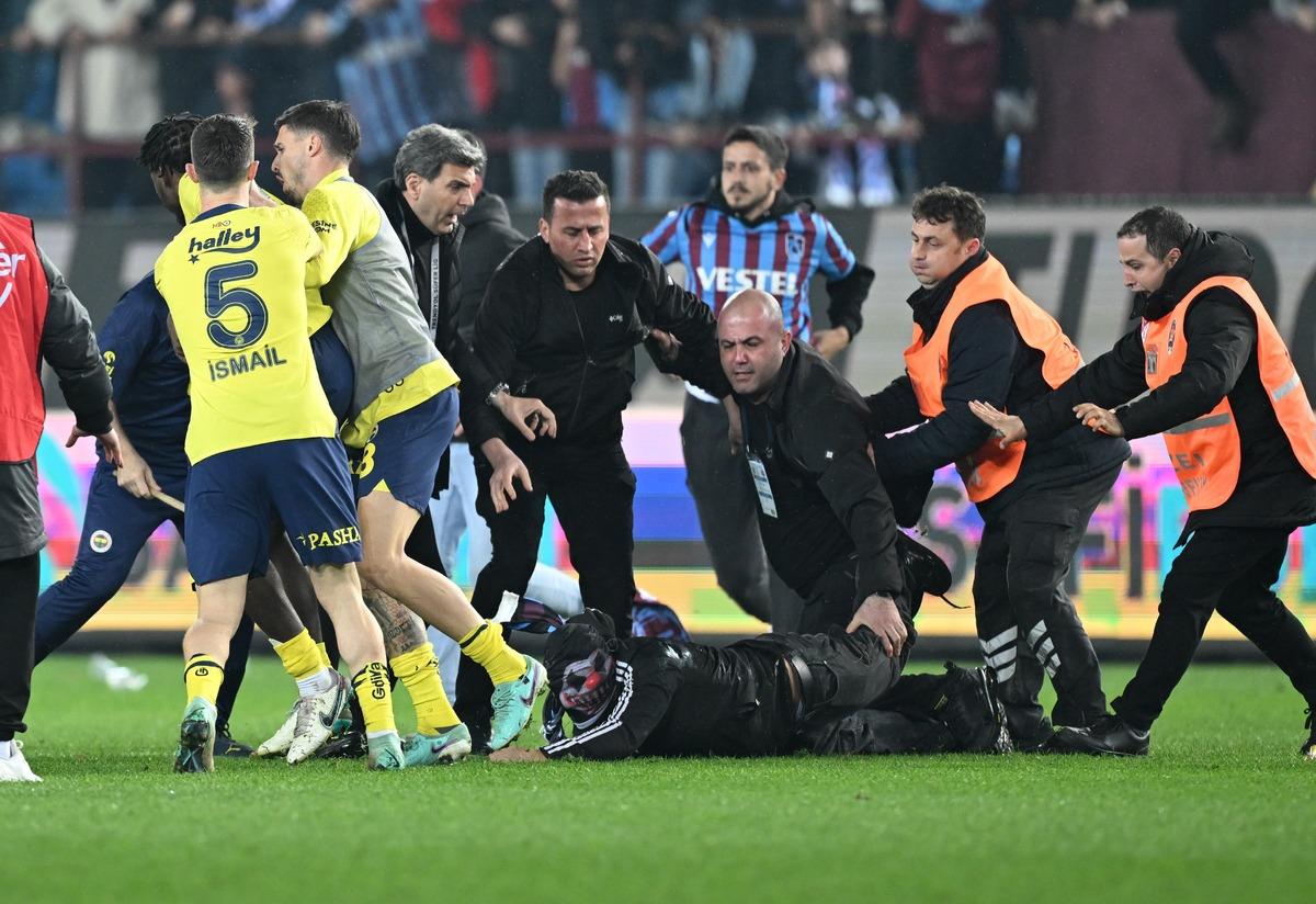 Trabzonspor-Fenerbahçe derbisinde çalan son düdükle saha karıştı. Fenerbahçe, mücadeleden 3-2 galip ayrılırken maç sonunda bordo mavili taraftarlar sahaya girdi. Orta yuvarlakta galibiyeti kutlayan Fenerbahçeli futbolculara saldırmak isteyen taraftarlara, güvenlik görevlileri müdahale etmeye çalıştı.