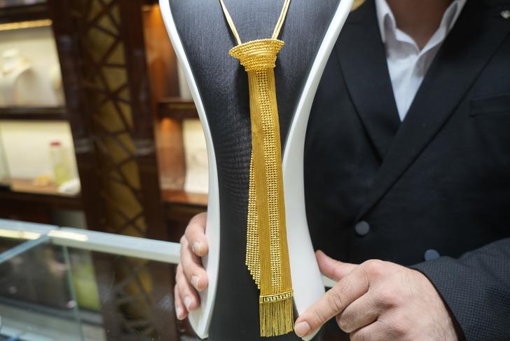 Zengin kültürel mirası ve geleneksel el sanatlarıyla öne çıkan Gaziantep’te kuyumcular klasik mücevheratın ötesine geçerek altın kravat modeli üretti. Kentte, son zamanlarda trend ürün olarak üretilen altın kravatlar geleneksel el işçiliğinin ve modern tasarımın birleşimi olarak kuyumcularda yerini aldı. Kuyumcu esnafı, benzersiz tasarımı ve işçiliğiyle öne çıkan altın kravatın, piyasaya yeni sürülmeye başlamasına rağmen ilgi gördüğünü ifade etti. Düğünlerde ve özel günlerde moda haline gelmesi beklenen altın kravatın ağırlığı 120 ila 150 gram arasında değişirken fiyat olarak ise güncel piyasaya göre ortalama 350 bin TL’den satılıyor.