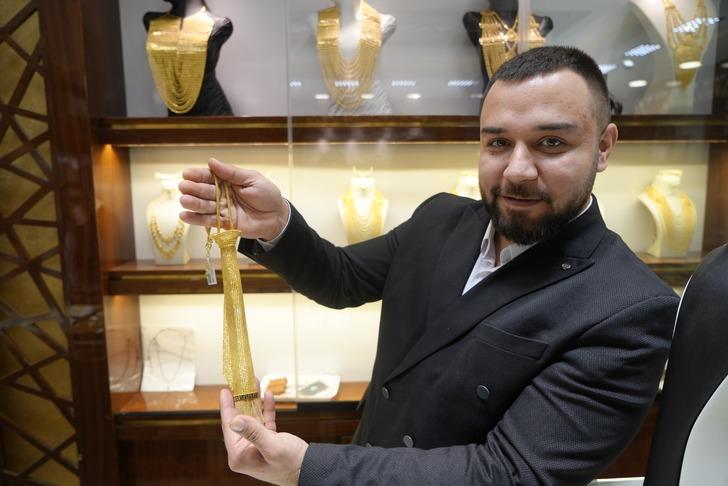 Katarda kuyum atölyesinden ilham alarak ürettikleri altın kravat modeliyle Gaziantep’te altın sektörüne yenilik kattıklarını belirten kuyumcu Murat Kocaardıç, “Gaziantep’te kadınlara yönelik altın kemerlerimiz mevcut.
