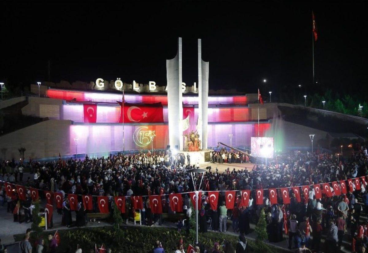 Gölbaşı Belediyesi tarafından inşa edilen Şehitler Anıtı’nın açılışı, Bilim, Sanayi ve Teknoloji Bakanı Faruk Özlü’nün katıldığı törenle gerçekleştirildi.Gölbaşı’nda 15 Temmuz Demokrasi ve Milli Birlik günü etkinlikleri kapsamında bir dizi program gerçekleştirildi. Gölbaşı Belediyesi’nce yaptırılan Şehitler Anıtı’nın açılışı saygı duruşu ve İstiklal Marşı’nın okunmasıyla başladı. Ardından 15 Temmuz darbe girişimi gecesinde Gölbaşı’nda yaşanan olayları anlatan bir sinevizyon gösterisi yapıldı.“Allah bir daha milletimize 15 Temmuz’u göstermesin”Bakan Özlü, Gölbaşı Şehitler Anıtı açılış töreninde yaptığı konuşmada, 15 Temmuz’un yurt dışı destekli bir çete hareketi olduğunu söyledi. 15 Temmuz’un Türkiye’yi esir almak ve Türkiye’de hükümeti devirmek isteyen bir hareket olduğunu vurgulayan Özlü, “Allah bir daha milletimize 15 Temmuz gibi geceleri göstermesin. Bu güzel eserin, Şehitler Anıtı’nın, yapımında emeği geçen Belediye Başkanımıza teşekkür ediyorum. Bu eserin Gölbaşı’na hayırlı uğurlu olmasını diliyorum” diye konuştu.“Gölbaşı ilçesinin kahramanlığını tüm dünya biliyor”AK Parti Genel Başkan Yardımcısı Fatih Şahin de 15 Temmuz gecesinde gösterdiği çabadan dolayı tüm dünyanın Gölbaşı ilçesini bildiğini aktararak, şunları kaydetti:“15 Temmuz gecesi sadece darbe girişimi değildi, o gece aynı zamanda bir işgal girişimiydi. O gece aynı zamanda devletimizi bölme girişimiydi. Aziz milletimizi paralama girşimiydi. Ülkemizi sömürgüleştirme girişimiydi. Ancak o gece dünya tarihine geçecek bir direniş sergilendi.”Gölbaşı Kaymakamı Şenol Esmer ise Türkiye’nin 15 Temmuz’da birçok ile göre en çok şehit veren ilçe olduğunun altını çizerek, “Gölbaşı bundan sonra kutsal toprakları olan bir yer demektir. Bu günleri unutmamak, unutturmamak adına da bu anıtları yapıyoruz. Biz 15 Temmuz’u unutturmayacağız” dedi.“Anıtımız hainlerle mücadele eden kardeşlerimizi simgeliyor”Gölbaşılıların 15 Temmuz’da birçok yerde mücadele ettiğinin altını çizen Gölbaşı Belediye Başkanı Fatih Duruay, “15 Temmuz gecesi yaşanan olayların bir çoğu Gölbaşı’nda meydana geldi. Gölbaşı’nda vatanını, milletini seven bu bayrak için hiç gözünü kırpmadan canını veren insanların o gün mücadele günüydü. İşte bu günde onları unutmamak ve bizden sonraki nesillere unutturmamak adına burada bir anıtımız var. Bu anıtımız genciyle yaşlısıyla vatanını milletini seven polis kardeşlerimizle beraber o hainlere dur demek için mücadele eden kardeşlerimizi simgeliyor. Bundan sonraki mücadelelerde bizler her zaman olacağız ve o hainleri gereken cevabı vereceğiz” şeklinde konuştu.Gölbaşılılardan “Milli Birlik Yürüyüşü”Törenden önce, Gölbaşı Kaymakamlığı önünde, AK Parti Ankara Milletvekilleri Fatih Şahin ve Murat Alparslan, Kaymakam Esmer, Başkan Duruay, belediye meclis üyeleri, siyasi parti ilçe başkanları, STK temsilcileri, muhtarlar ve çok sayıda Gölbaşılı vatandaş, ellerinde Türk bayraklarıyla ve meşalelerle, Gölbaşı Şehitler Anıtı’na kadar yürüdü. Yürüyüşe katılan vatandaşlar, “Şehitler ölmez, vatan bölünmez” sloganlarıyla, Gölbaşı sokaklarını inletti.