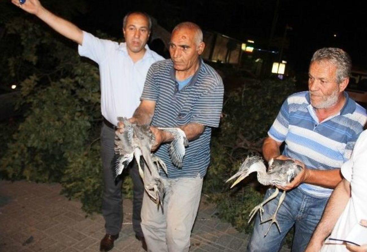 Iğdır Belediye binası karşısında bulunan tarihi çınar ağacı kökünün çürümesi sonucu devrilirken, üzerindeki yuvadan yere düşen 2 gri balıkçıl kuş yavrusu da koruma altına alındı.Edinilen bilgiye göre gece saat 02.30 sıralarında kökü çürüyen asırlık ağaç, büyük bir gürültüyle devrilerek yola düştü. Olayda şans eseri ölen ya da yaralanan olmazken, ağacın dallarındaki yuvada bulunan gri balıkçıl kuşunun 2 yavrusu da yere düştü. Bölgeye gelen polisler, ağaçta başka yuva olması ihtimaline karşı yerdeki dalların arasında bir süre kuş aradı.YAVRU KUŞLARA HASTANEDE İLK MÜDAHALEGece saatlerinde veteriner bulamayan yetkiler, kuş yavrularını Iğdır Devlet Hastanesi acil servisine götürerek kanatlarına pansuman yaptırdı. İlk müdahalesi yapılan yavrular, Iğdır Orman ve Su İşleri Müdürlüğü Doğal Hayatı Koruma Şubesi yetkililerine teslim edildi.Iğdır Orman ve Su İşleri Müdürlüğü görevlisi Zeynep Çoban, şubelerinde veteriner kontrolünden geçirilen gri balıkçıl kuşlarının kanatlarının kırık olduğunun tespit edildiğini ve yavru kuşların tedavilerinin devamı için Kars Kafkas Üniversitesi Veterinerlik Fakültesi’ne gönderildiğini söyledi.Olayın yaşandığı anlarda işlek olan caddede kimsenin olmaması olası bir faciayı önlerken, yola düşen ağaç ise iş makinesi yardımıyla kaldırıldı.