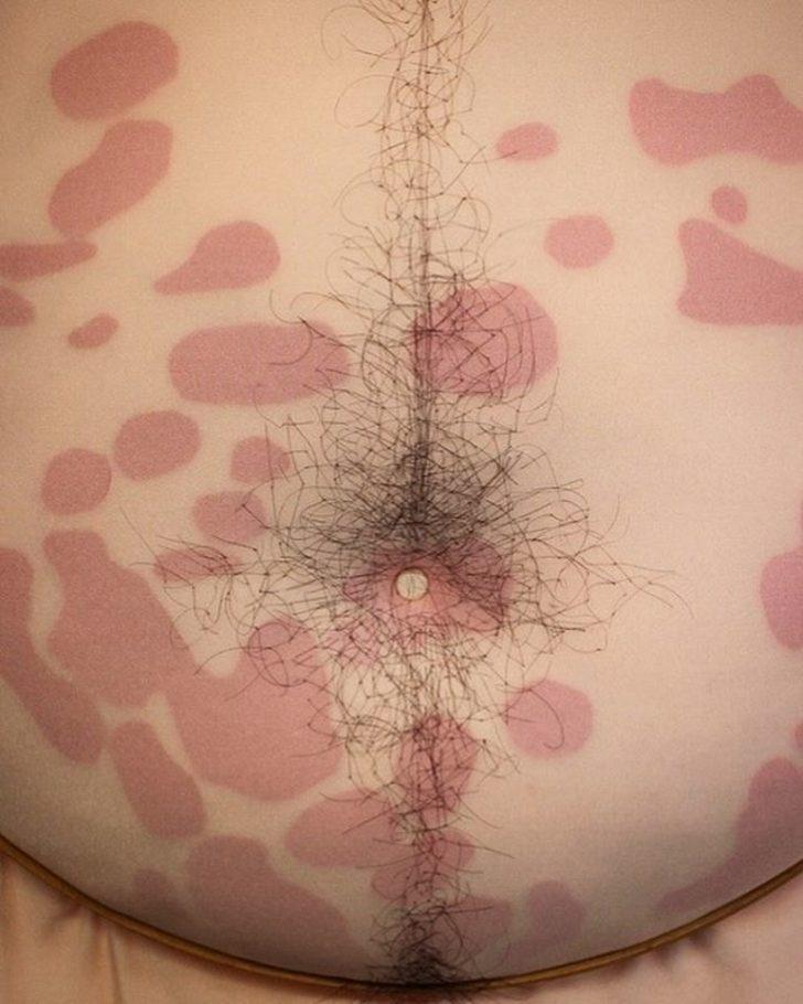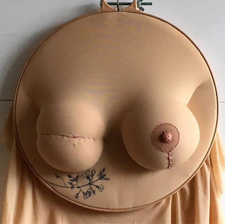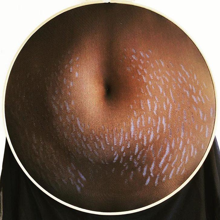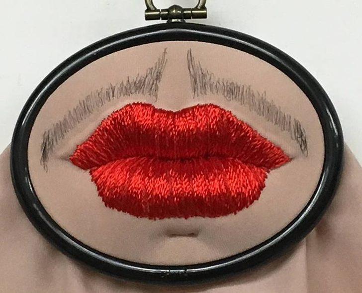 Hewett’in kanaviçelerinde göğüs kılları, selülitli ve dövmeli popolar yer alıyor. Derdi, ana akım pop kültüründe bize neyin güzel olduğunun öğretilmesiyle. Bu yüzden ‘insanlığımızın en temel parçalarını’ gerçek halleriyle nakşediyor!