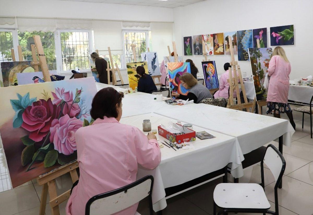Hanımlar Lokali’nde açılan resim kursuna katılan kadınlar, ücretsiz kursta eğitim görerek resim yapmayı öğreniyorlar. Yağlı boya, sulu boya ve karakalem çalışmaları yapan kursiyerler, 6 aylık eğitimin ardından çok başarılı eserler yapıyorlar.