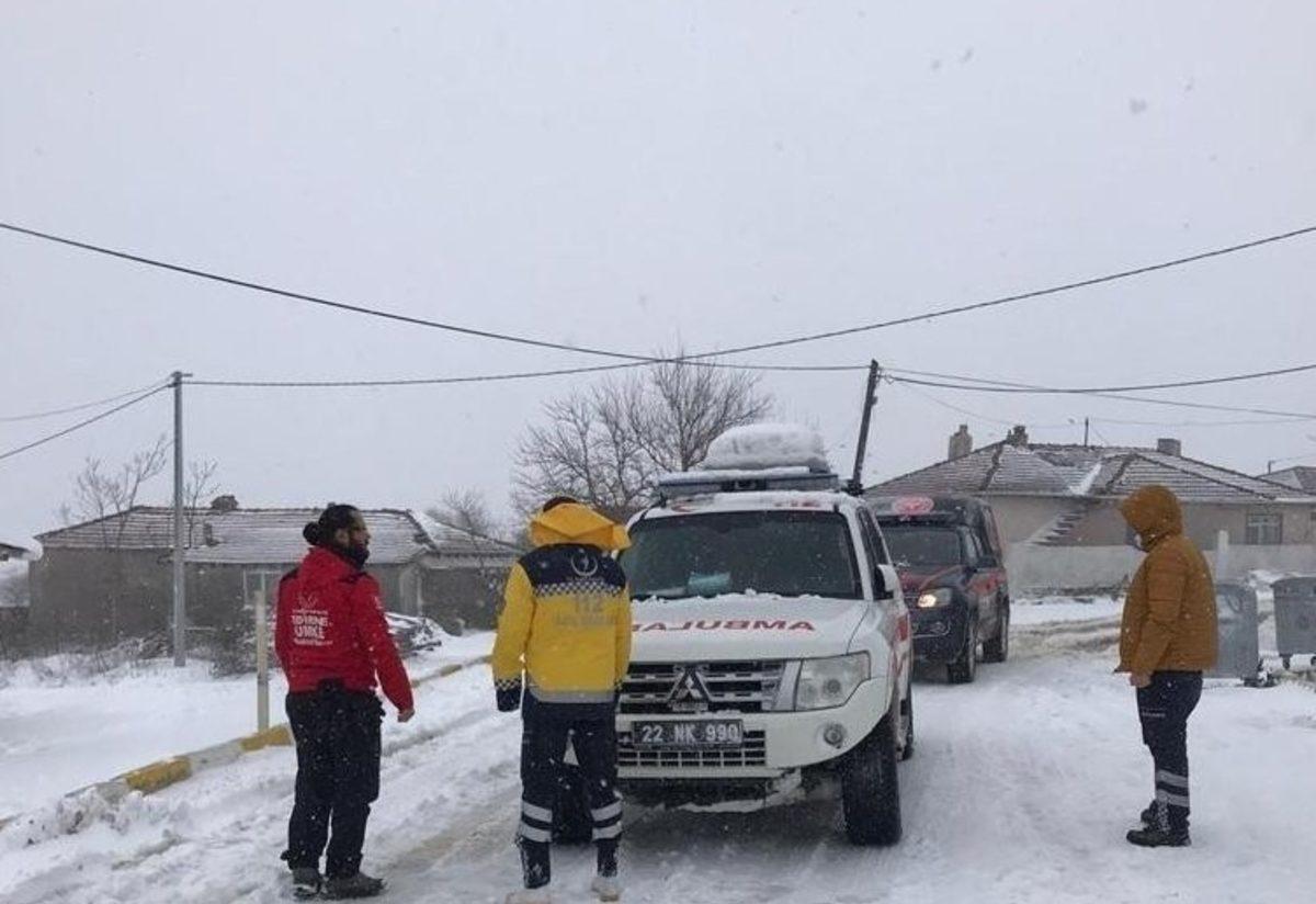 Edirne’de kar yağışı nedeniyle evinde mahsur kalan hasta, kar paletli ambulansla hastaneye kaldırıldı.