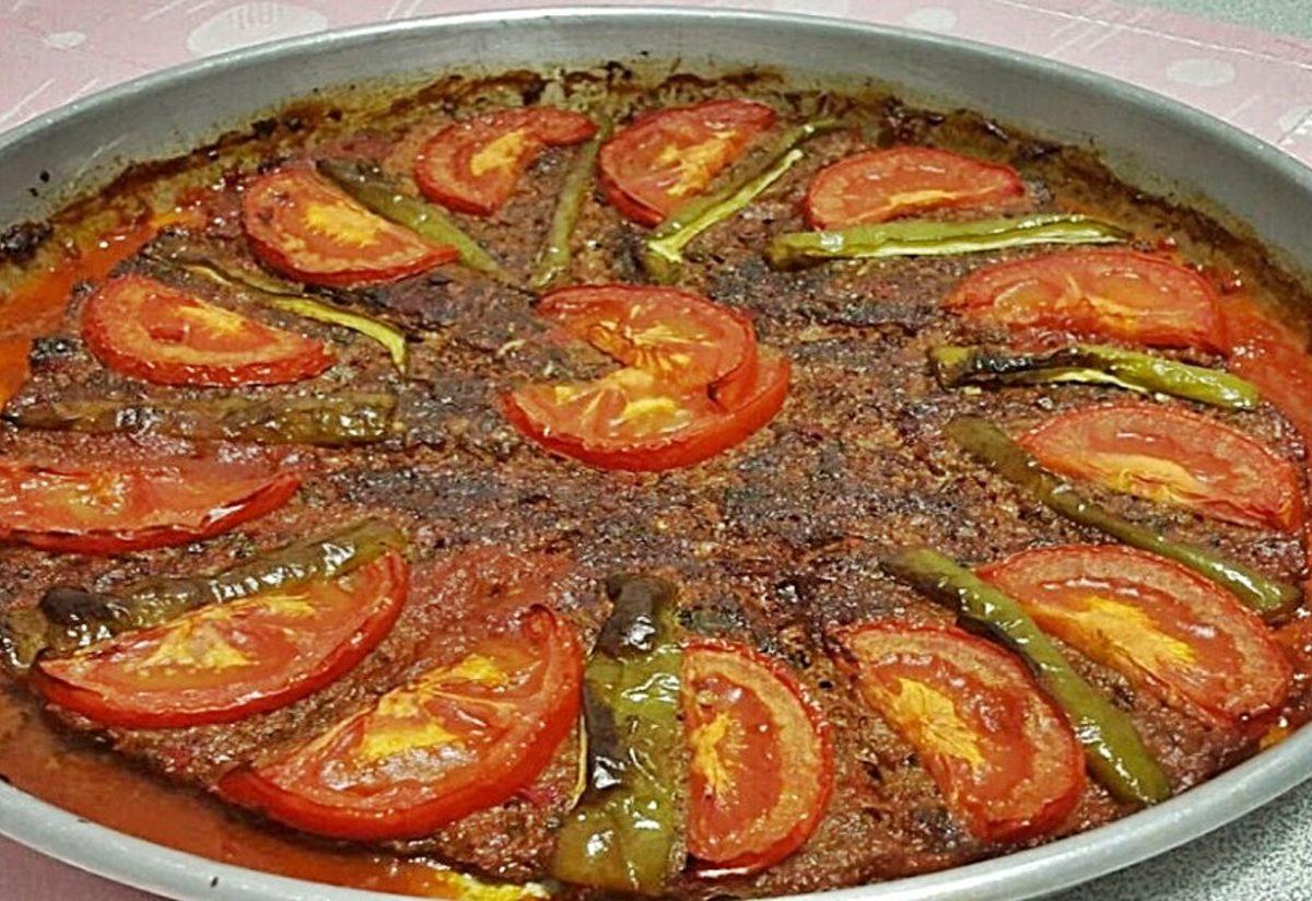 Üzerine yoğurmuş olduğunuz kıymayı düz bir şekilde yayarak yerleştirin. Kıymanın üzerini; yuvarlak doğradığınız kalan soğanlar, iri jülyen doğradığınız yeşil biber ve yuvarlak doğradığınız domateslerle süsleyin. Daha önceden ısıtılmış 200 derece fırında 35-40 dakika pişirin. Fırından alıp sıcak olarak servis yapın. Afiyet olsun.
