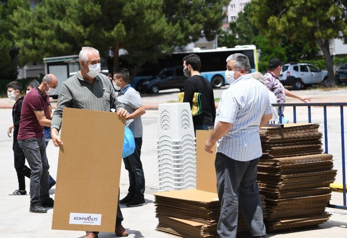 Konyaaltı Belediyesi, 74 gün sonra cuma namazı ile yeniden ibadete açılan cami avluları ve namaz kılınan pazar yerlerinde vatandaşlara maske ve üzerinde namaz kılınması için tek kullanımlık karton dağıttı.