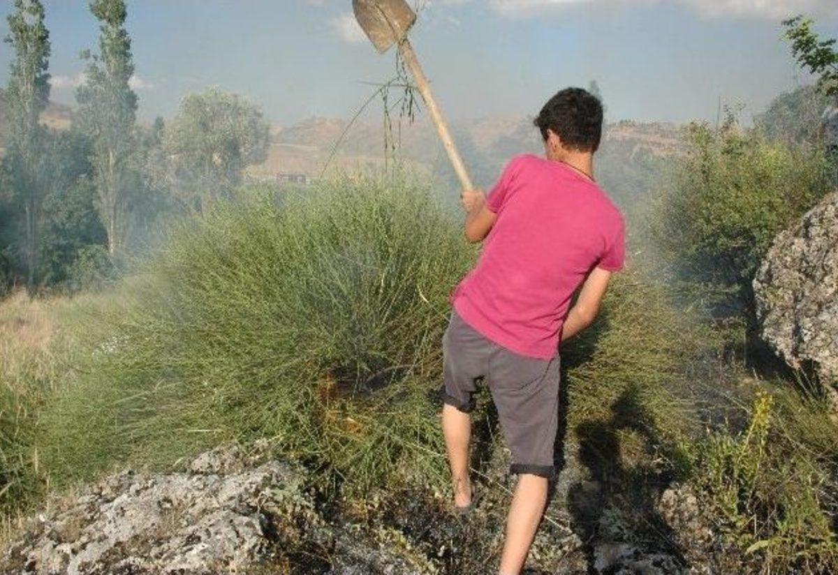Adıyaman’da, ekili olan arazilerin yan tarafında bulunan bahçede çıkan yangına müdahale eden çocuklar, bahçe kenarında...