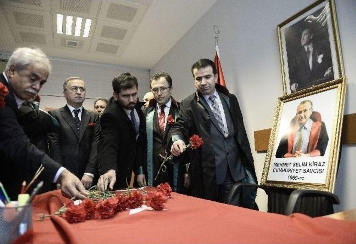Çağlayan’daki İstanbul Adalet Sarayı’nda rehin alındıktan sonra şehit edilen savcı Mehmet Selim Kiraz, şehit edildiği odada anıldı. Kiraz’ın şehit edildiği oda çatışmanın ardından ilk kez görüntülenirken, odadan yaşanan olayın izlerinin silindiği görüldü.Çağlayan’daki İstanbul Adalet Sarayı’nda rehin alındıktan sonra şehit edilen savcı Mehmet Selim Kiraz,şehit edilişinin 7’nci gününde Hukukçular Derneği üyesi bir grup avukat tarafından karanfillerle anıldı. Bir grup avukat gerekli izinlerin alınmasının ardından şehit savcı Kiraz’ın olayın yaşandığı odasına çıktı. Savcının kapısına “Şehit Cumhuriyet Savcısı Mehmet Selim Kiraz” yazıldığı görüldü. Odanın önünde bir süre karanfillerle bekleyen avukatlar, ellerindeki Türk bayrağıyla çatışmanın yaşandığı odaya girdi. Savcı Kiraz’ın şehit edildiği oda çatışmanın ardınsan ilk kez görüntülendi. Kiraz’ın odasında çatışmanın izlerinin silindiği görüldü.Savcının odasına giren grup, odaya Türk bayrağı koydu. Avukatlar savcı Kiraz’ın bir fotoğrafını da koltuğuna koydu. Avukatlar daha sonra odaya karanfil bıraktı. Adliye içinde ise şehit savcı Kiraz için Fatiha okundu.Adliye içinde grup adına yapılan açıklamada, “Bir savcının görevi başından vurulması derin bir üzüntüye neden olmuştur. Kaos plancılarının ekmeğine yağ sürecek şekilde merhum savcının fotoğraflarının manşetlerden verilmesi ayrıca acıyı derinleştirmiştir” denildi.