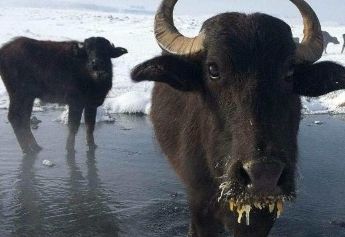 Van’ın Çaldıran ilçesinde, kar ve dondurucu soğuklara karşı mandalar Kaz Gölü Çayı’nın zemininden çıkardıkları taze otla besleniyor.Çaldıran ilçesinde gece hava sıcaklığının eksi 22 dereceye kadar düşmesi, hayatı durma noktasına getirdi. Türkiye’nin en soğuk yerleşim yerlerinden ilk sırada olan Van’ın Çaldıran ilçesinde etkisini gösteren soğuk hava nedeniyle yaşam durma noktasına getirirken, Kaz Gölü Çayı içerisinde otlayan mandalar adeta buz tuttu. Doğubayazıt yolu üzerinde bulunan Kaz Gölü’nde otlayan mandaların görünümü de ilçede yaşanan soğukları en iyi şekilde yansıtırken, sis ve ayazda tamamen donan bir çok dere soğuk havanın şiddetini gözler önüne serdi.