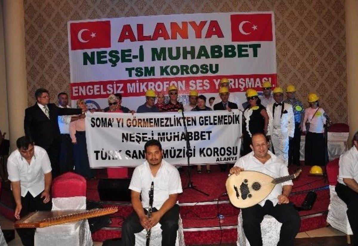 Antalya'nın Alanya ilçesinde faaliyet gösteren bir koronun organizasyonu ile Türkiye'de ilki düzenlenen görme engellilerin yarıştığı "Engelsiz Mikrofon Ses Yarışması"nda baretlerle sahneye çıkan görme engelli yarışmacılar, Soma faciasını unutturmamak adına "Soma'yı görmezden gelemedik" yazılı pankartı açtı.Alanya'da faaliyet gösteren Neşe-i Muhabbet Korosu'nun kurucusu olan Ünal Ayaz ve koro üyelerinden 11 yıldır görme engelli olan Habibe Özdil, Türkiye'de bir ilke imza attılar. Engellilere dikkat çekmek ve neler başarabildiklerini göstermek amacıyla ses yarışması organize eden ikili, internet üzerinden görme engelliler tarafından kullanılan elalemdiyalog.com adlı internet sitesi aracılığı ile Türkiye'nin dört bir yanındaki görme engelli vatandaşlara ulaştılar.Habibe Özdil ve Ünal Ayaz bir ses yarışması düzenlemek istediklerini belirtince, siteye üye olan yüzlerce görme engelli vatandaş yarışmaya konuya büyük ilgi gösterdi. Proje geliştiren ikili "Engelsiz Mikrofon Ses Yarışması" düzenlemeye karar verdi. 100 kişi arasından elemeleri geçen Bülent Çelik, Ebru Topal, Faruk Elibol, Hatice Uysal, Hikmet Karadeniz, Mehmet Karamanoğulları, Meral Acanikli, Necmi Özer, Osman Erensoy, Süheyla Parlak, Şükrü Dinç, Mustan Güleş adlı yarışmacılar Alanya'ya geldiler. Alanya halkının kucak açtığı yarışmacılar 3 gün süresince burada ağırlandılar.Cikcilli Düğün Salonu'nda düzenlenen yarışma öncesi baretlerle sahneye çıkan görme engelli yarışmacılar, Soma faciasını unutturmamak adına "Soma'yı görmezden gelemedik" yazılı pankartı açtılar.Jüri üyeliğini Türkiye Gazeteciler Federasyonu (TGF) Genel Başkan Yardımcısı ve Alanya Gazeteciler Cemiyeti (AGC) Başkanı Mehmet Ali Dim, Otel Temizlik Eğitimi ve Dekorasyon Derneği (OTED) Alanya Yönetim Kurulu Başkanı Hakan Yeni, Altın Kepçe Turizm ve Aşçılar Derneği Başkanı Nail Özden, ünlü sanatçı Hadi Cantemur, sevilen sanatçı Cihan Erman, Ayşe Çakıroğlu, Gülnur Erbudak Ağca ve Udi-Bestekar Ümit Aşık'ın yaptığı gecede, birinciliği İstanbul'dan katılan Hikmet Karadeniz, ikinciliği İzmir'den katılan Hatice Uysal ve üçüncülüğü ise yine yarışmaya İstanbul'dan katılan Süheyla Parlak kazandı.İzleyenler arasında Alanya Belediye Başkanı Adem Murat Yücel, eşi Yıldız Yücel ile Alanya Devlet Hastanesi Başhekimi İsmail Başaran İle Filiz Tören Başaran'ın da bulunduğu yarışmada, ödüller jüri üyeleri tarafından verildi. Yarışmayı organize eden Ünal Ayaz ve Habibe Özdil ise yoğun ilgi göstererek kendilerini yalnız bırakmayan herkese teşekkür etti.